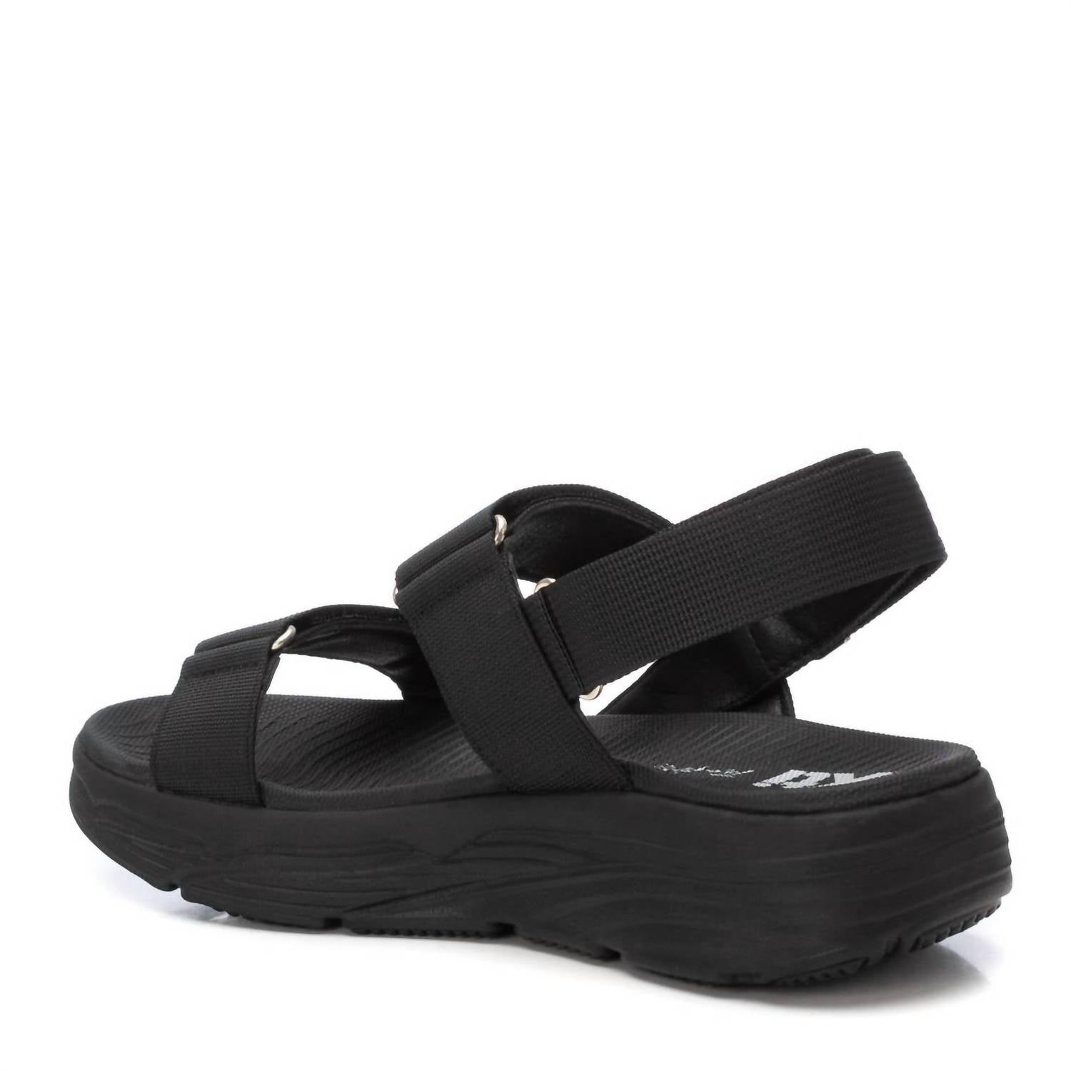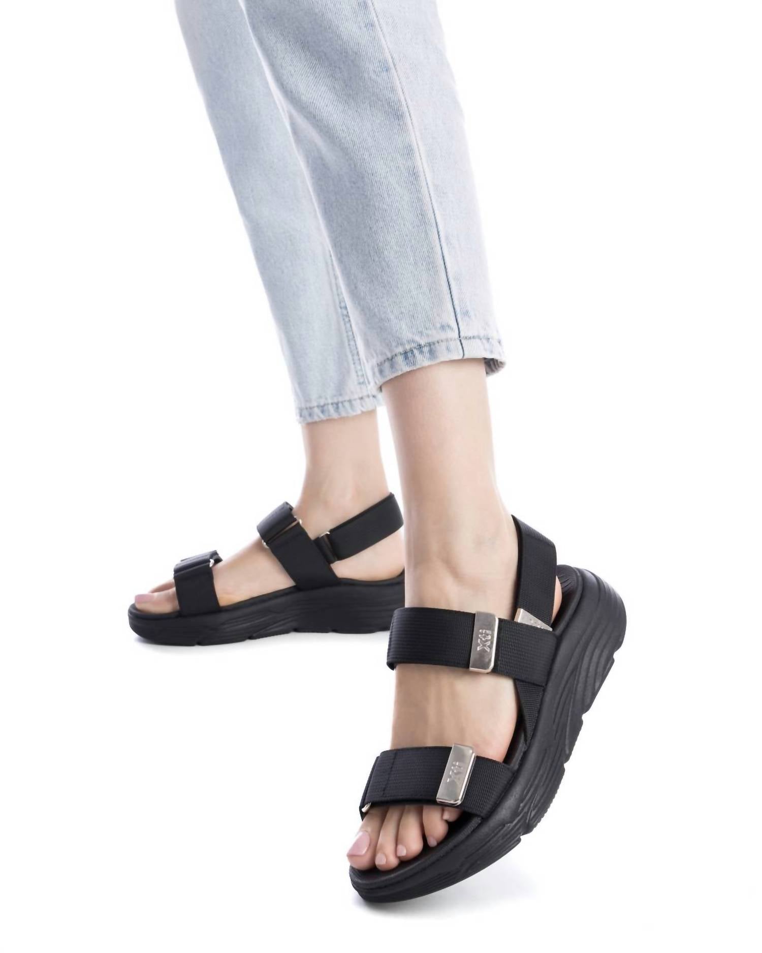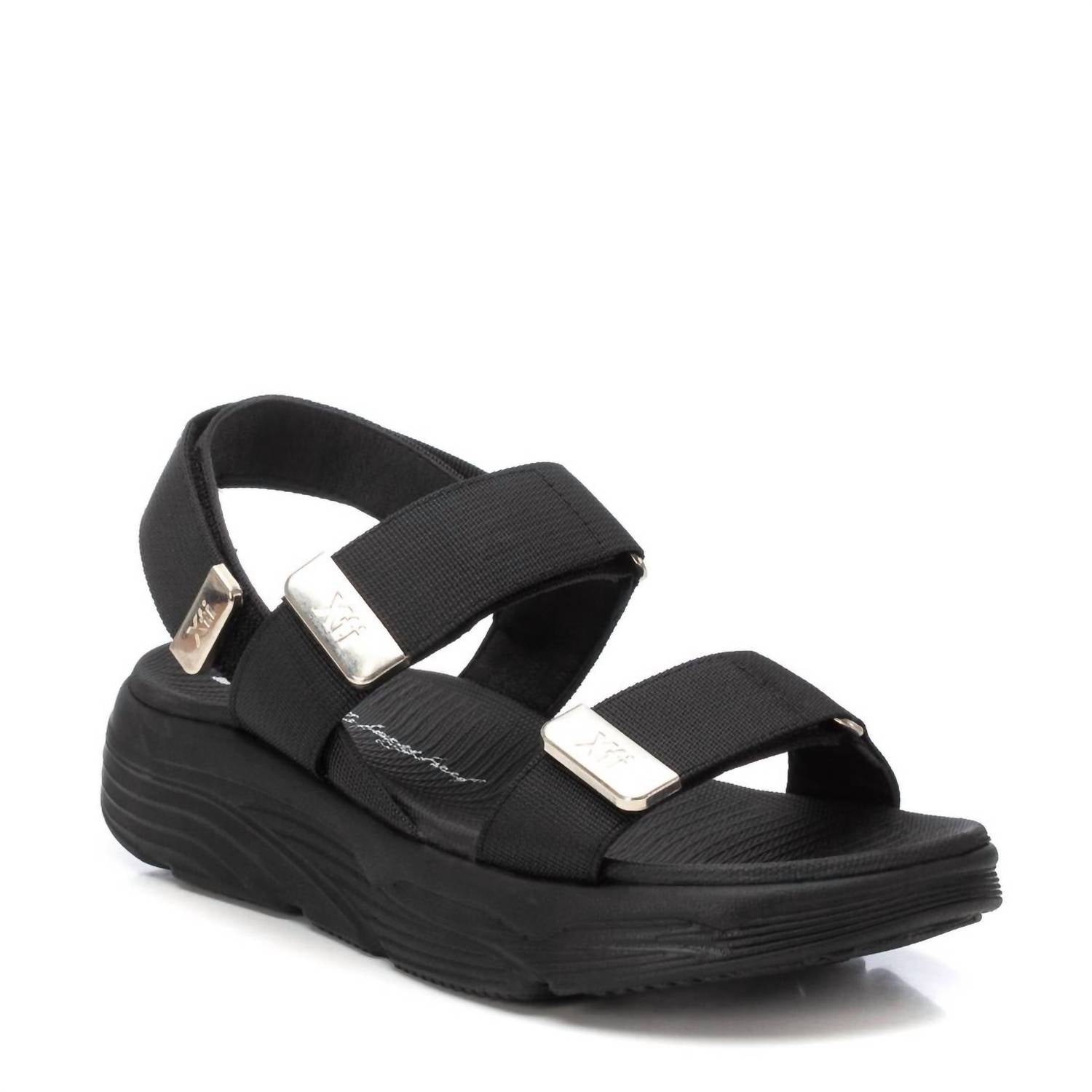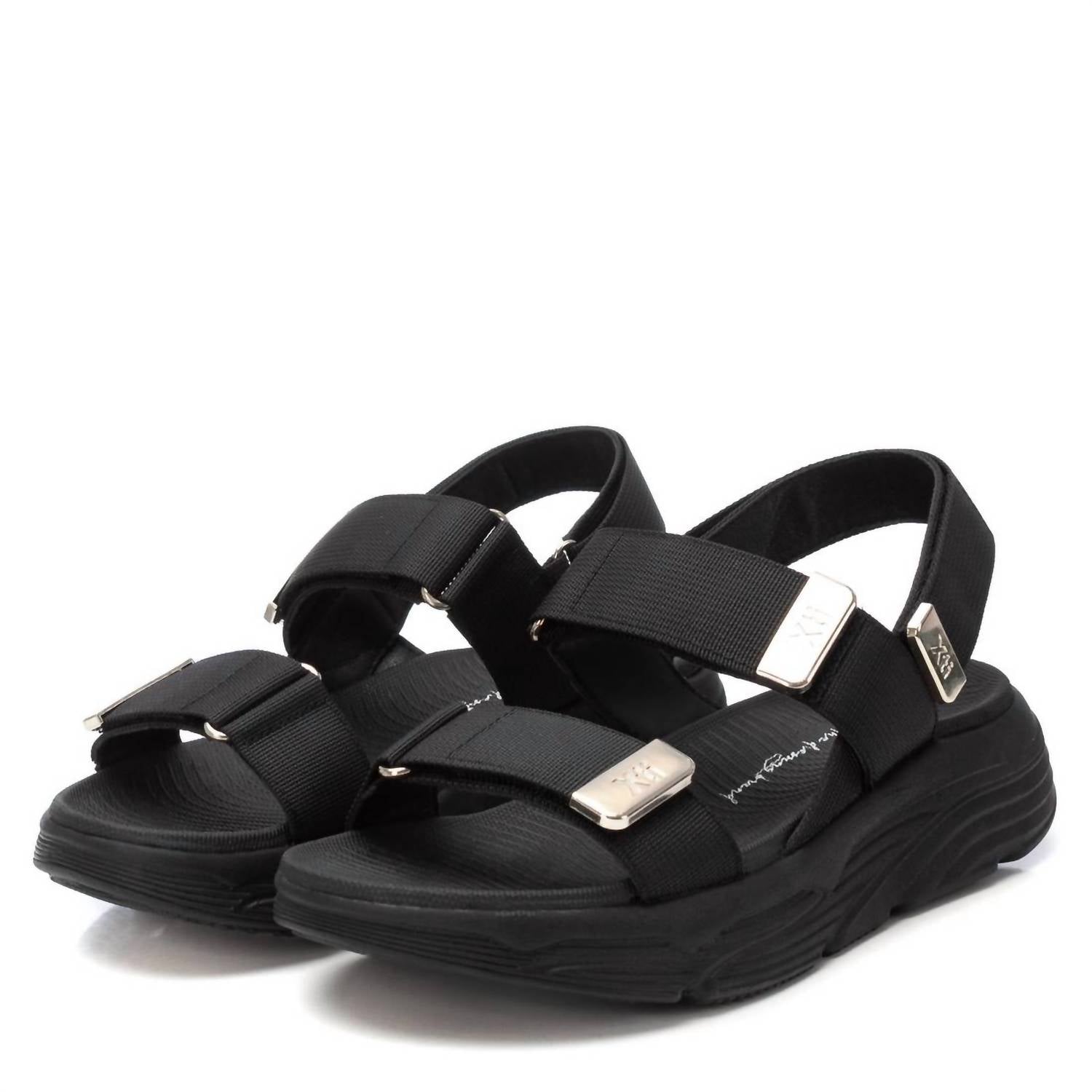 Step out in style with the Women's Casual Wedge Sandals by Xti, crafted for both comfort and trendsetting flair. These sandals are made from high-quality textile material and feature a sporty, non-slip sole. Designed with a double shovel strap and an adhesive Velcro closure, they include metallic details that elevate their casual style. With a low wedge heel measuring 1 to 3 cm, these black sandals are vegan-certified by PETA and perfect for any casual outing.