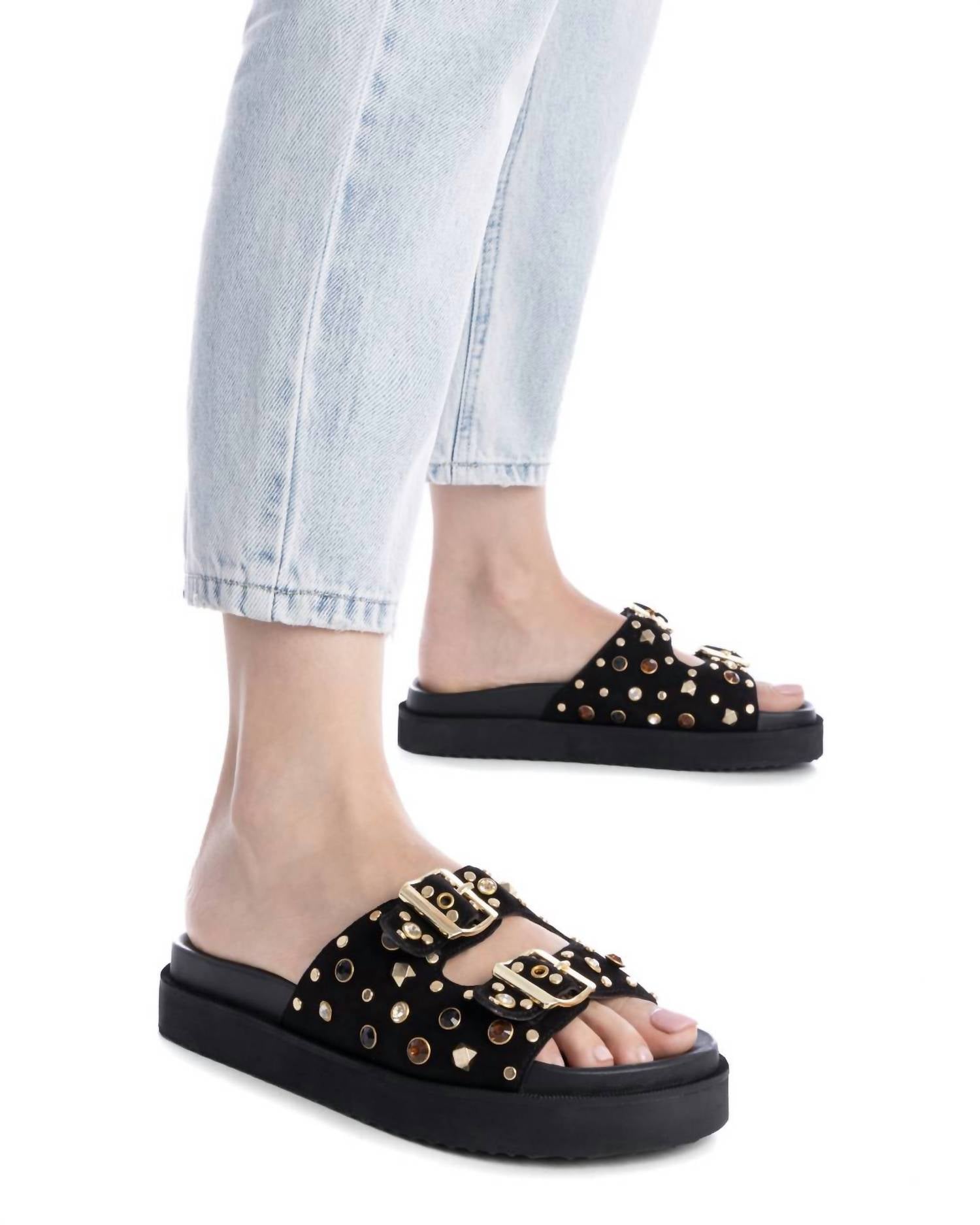 Classicly cute and all-day-wearable. We love this sandal. Elevate your footwear collection with the Women's Double Buckle Sandals by Xti, a part of the Carmela Genuine Leather Collection. These sandals feature a sleek leather construction, offering comfort and style for any occasion. Designed with a round toe and flat heel, they provide a chic yet practical option for day-to-night wear. Perfect for work or social outings, these sandals ensure you step out in confidence.