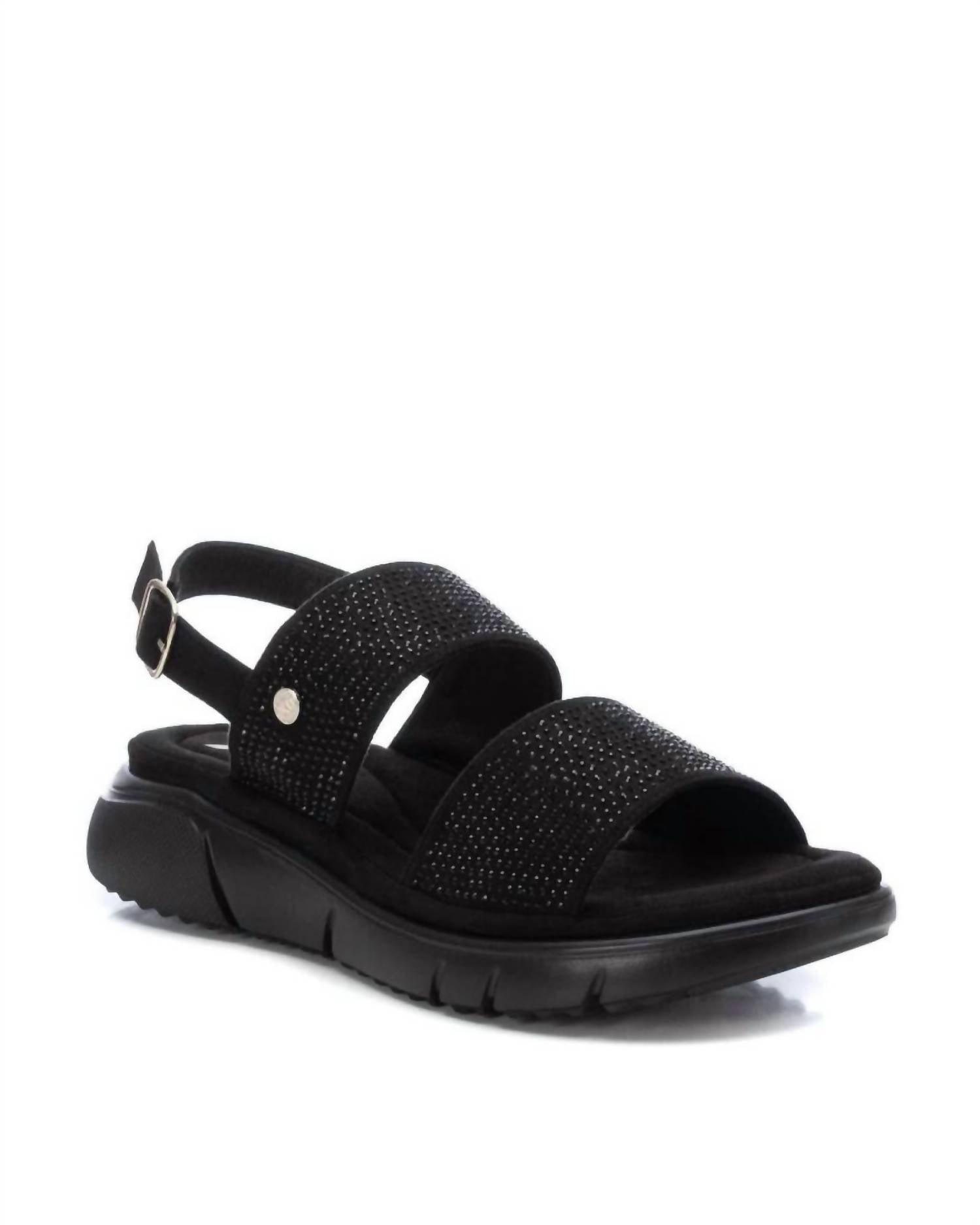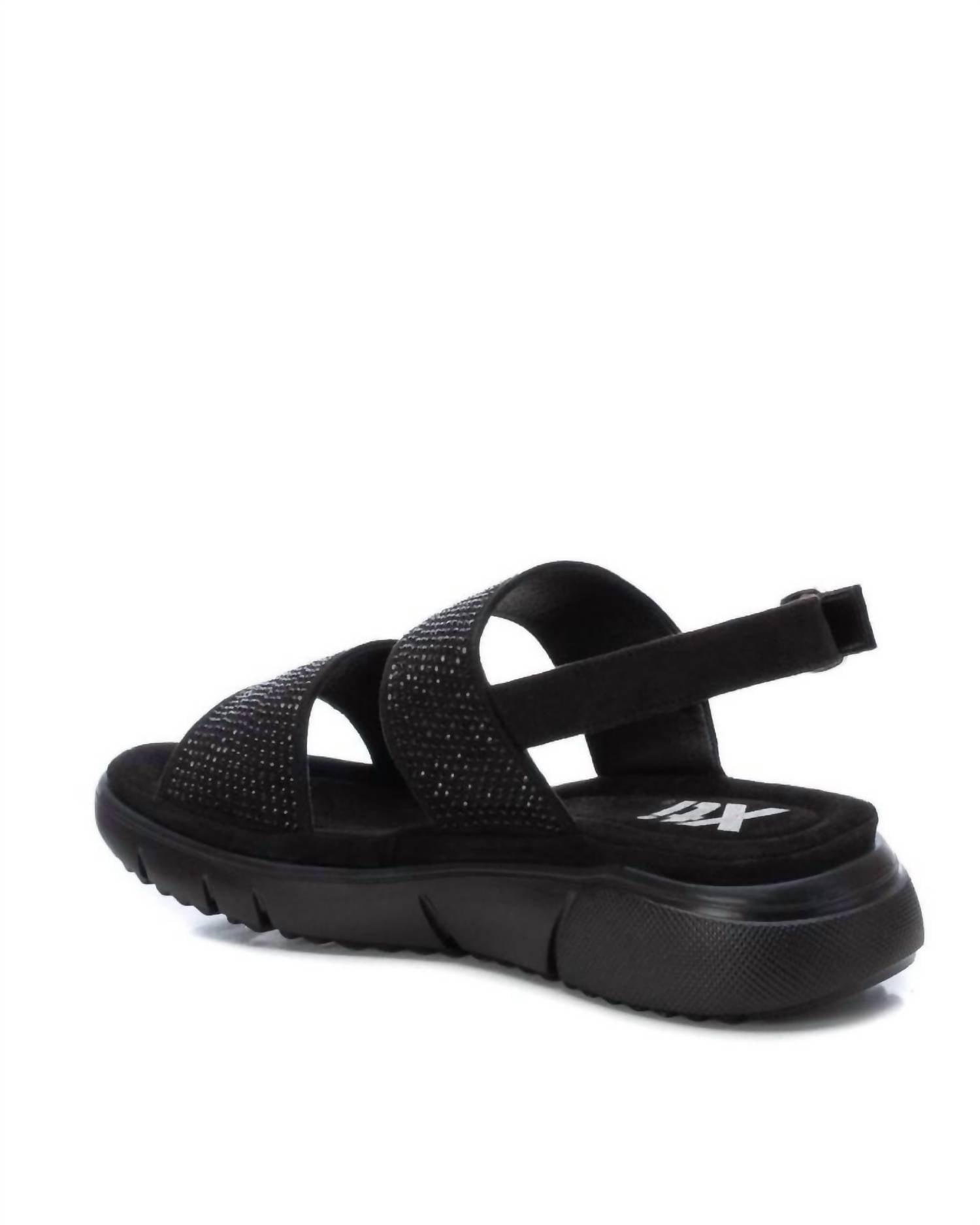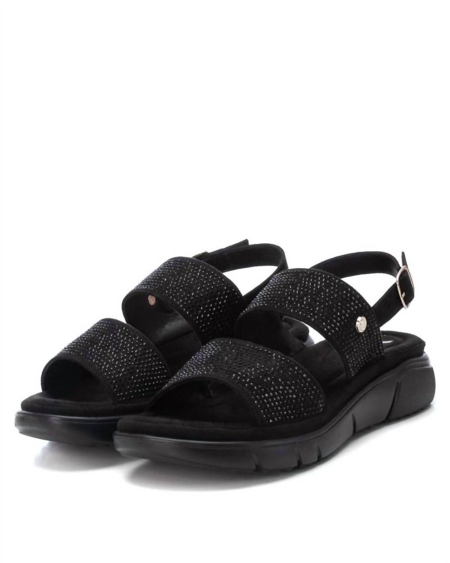 This sandal will take you from brunch to dinner and everything in between. Crafted from synthetic suede. The double strap design is intricately adorned with decorative mini stones. The buckle closure ensures a secure and adjustable fit, while the durable non-slip rubber sole provides steadfast footing.