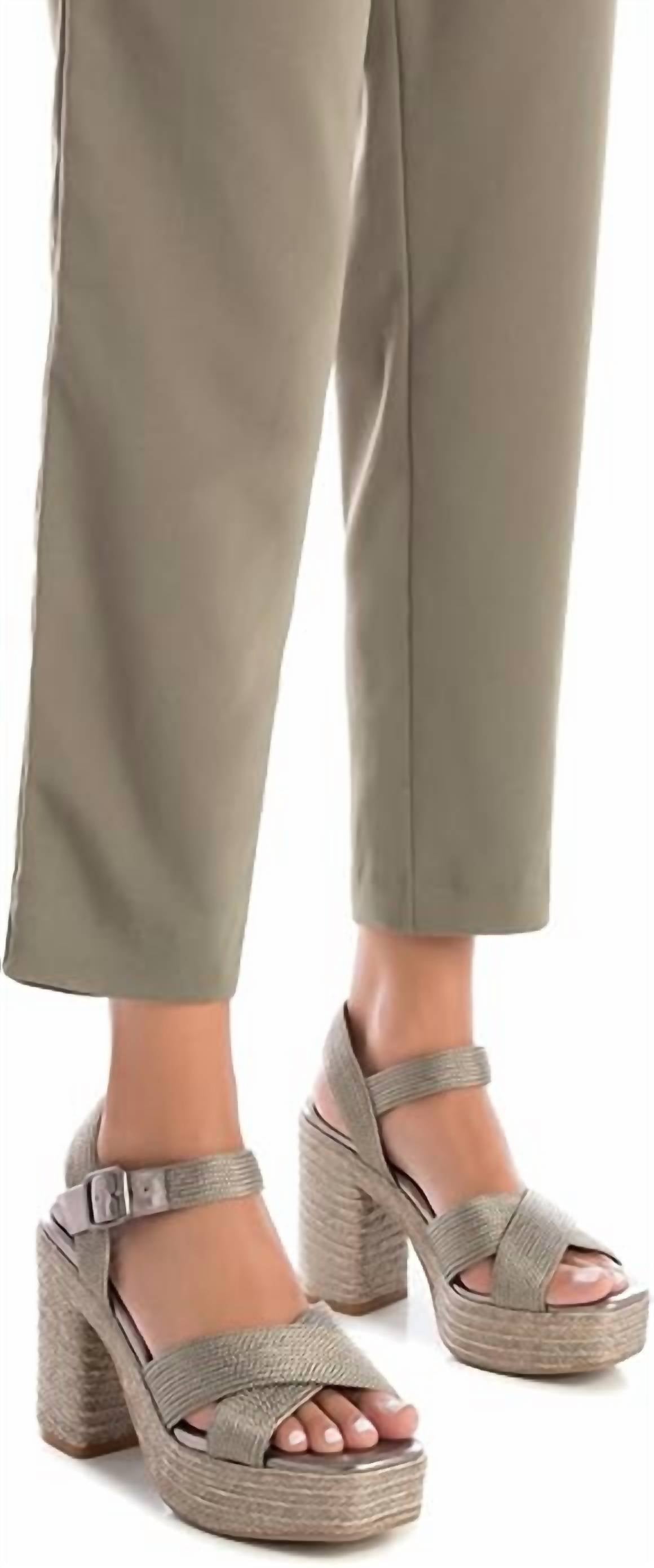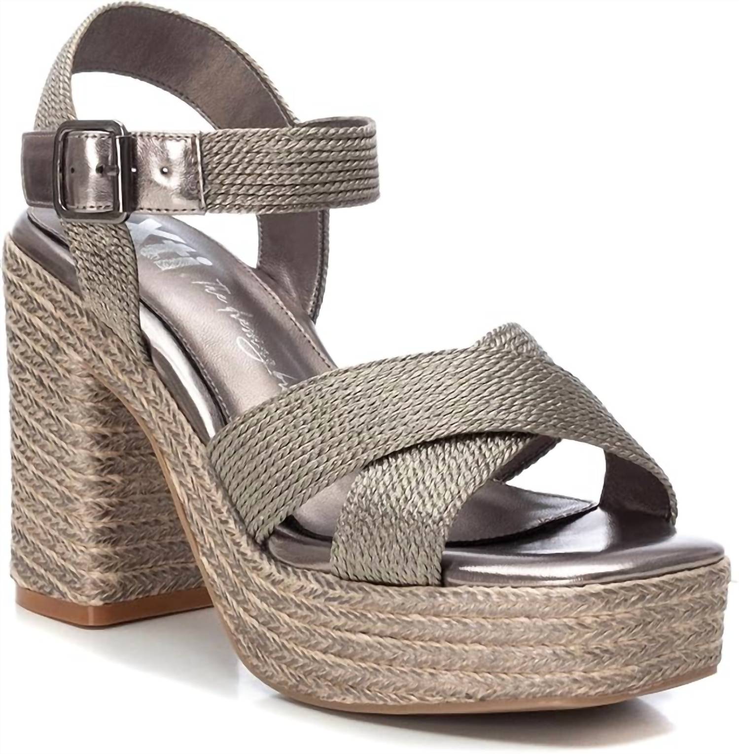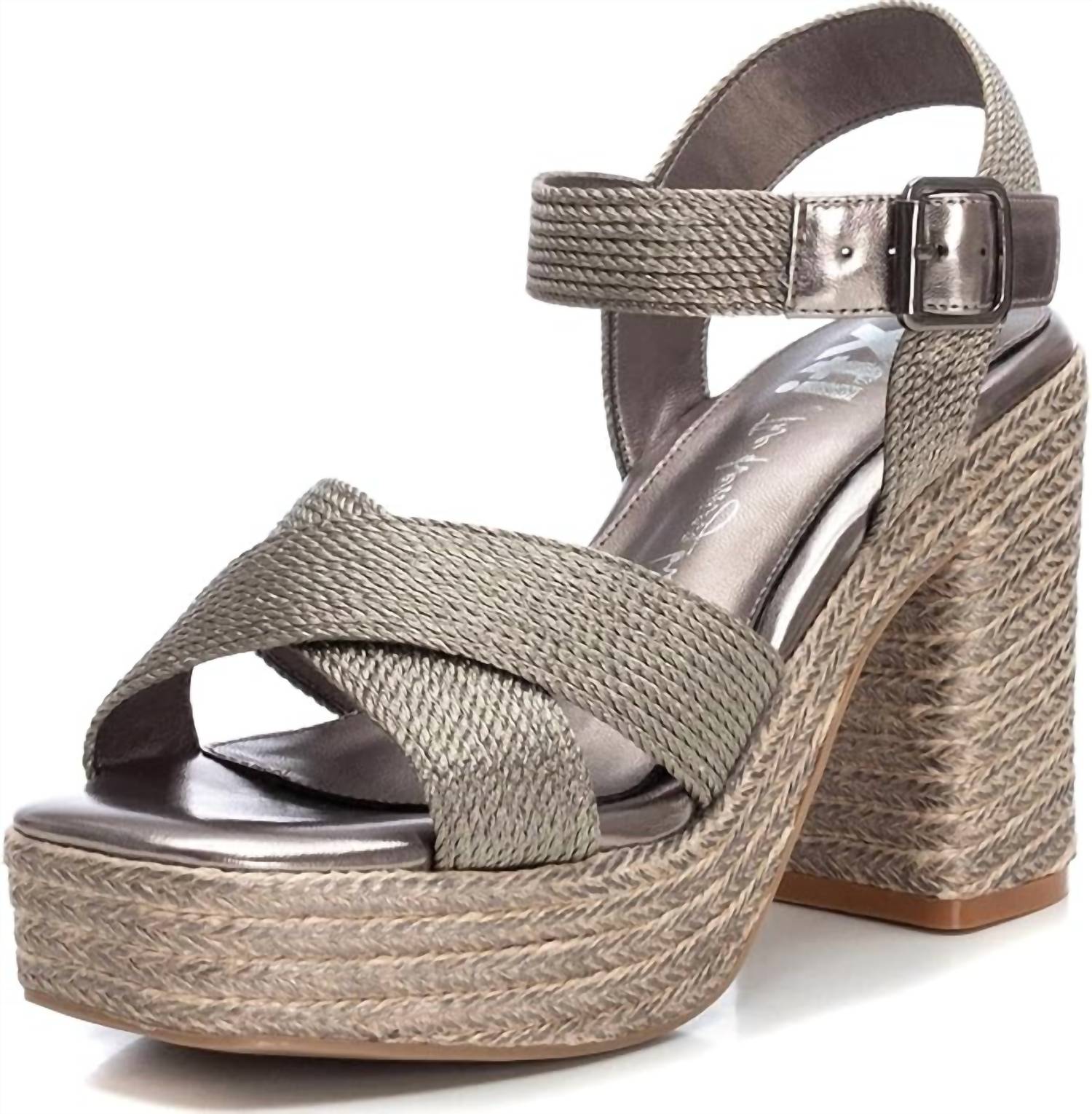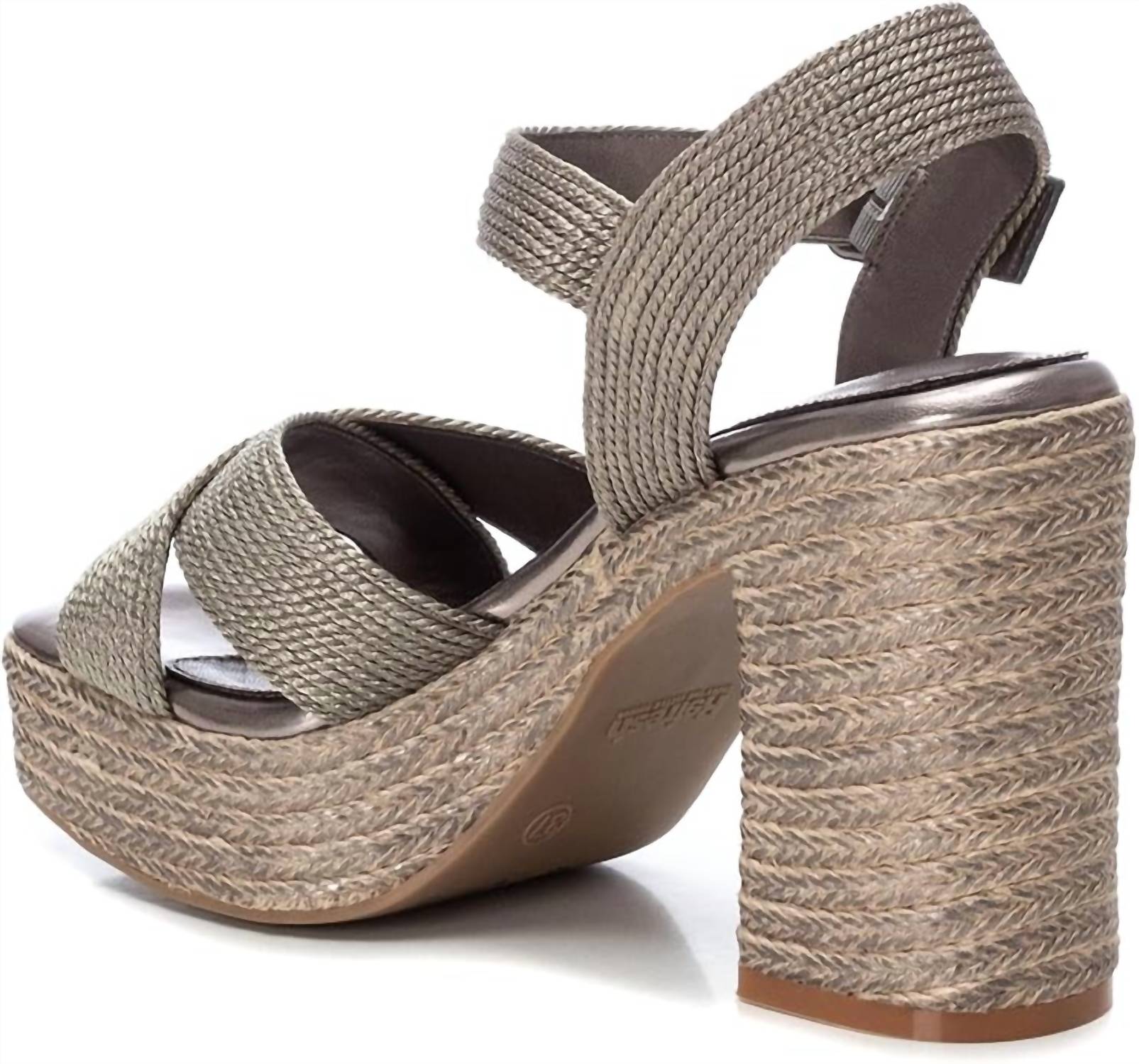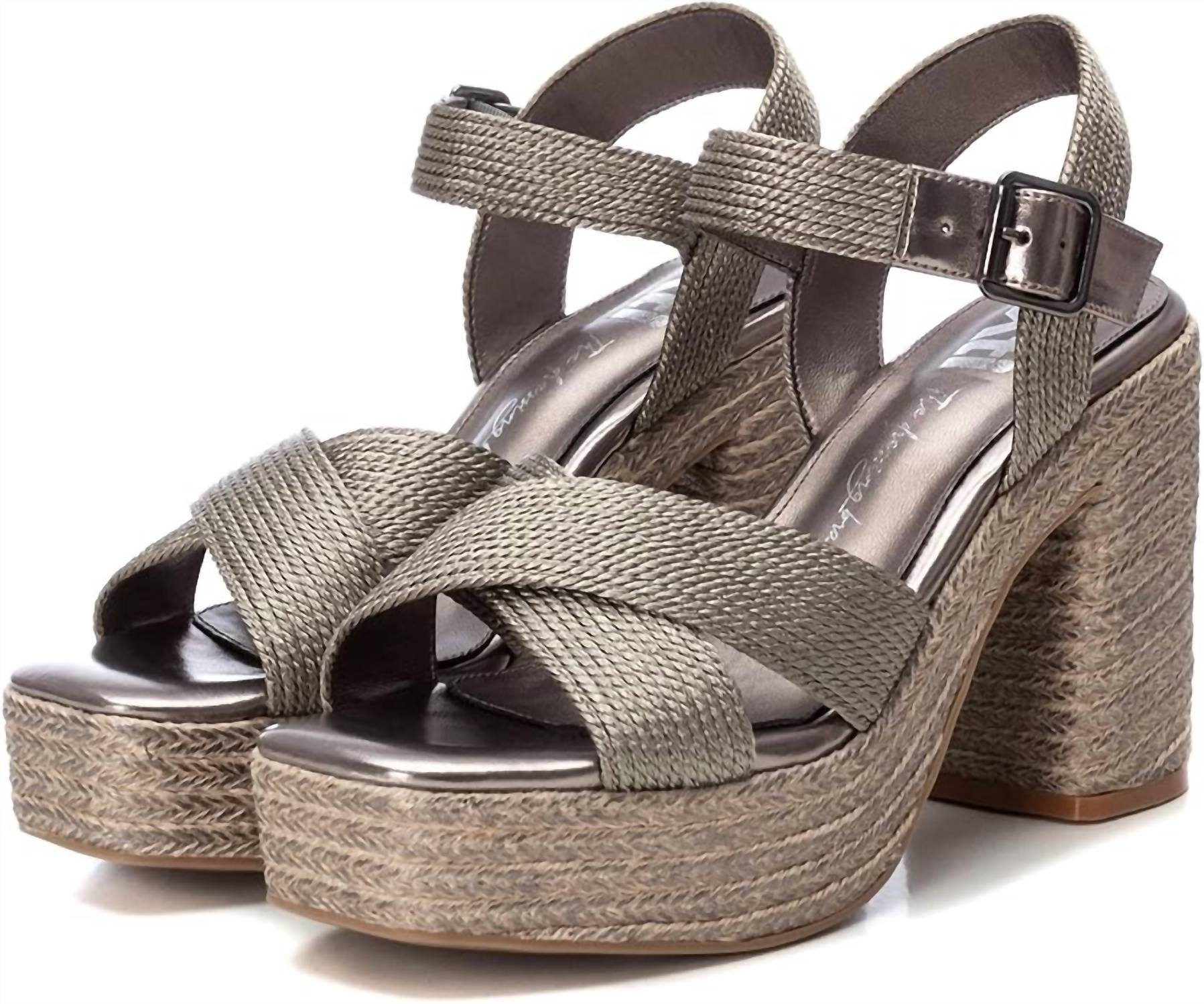 This Heeled Sandal features luxurious metallic textile material with a metallic buckle closure for a secure fit. The block heel is wrapped in metallic jute, and the front platform and non-slip rubber sole provide added support and grip. PETA-certified vegan, perfect for both stylish and ethical wear.