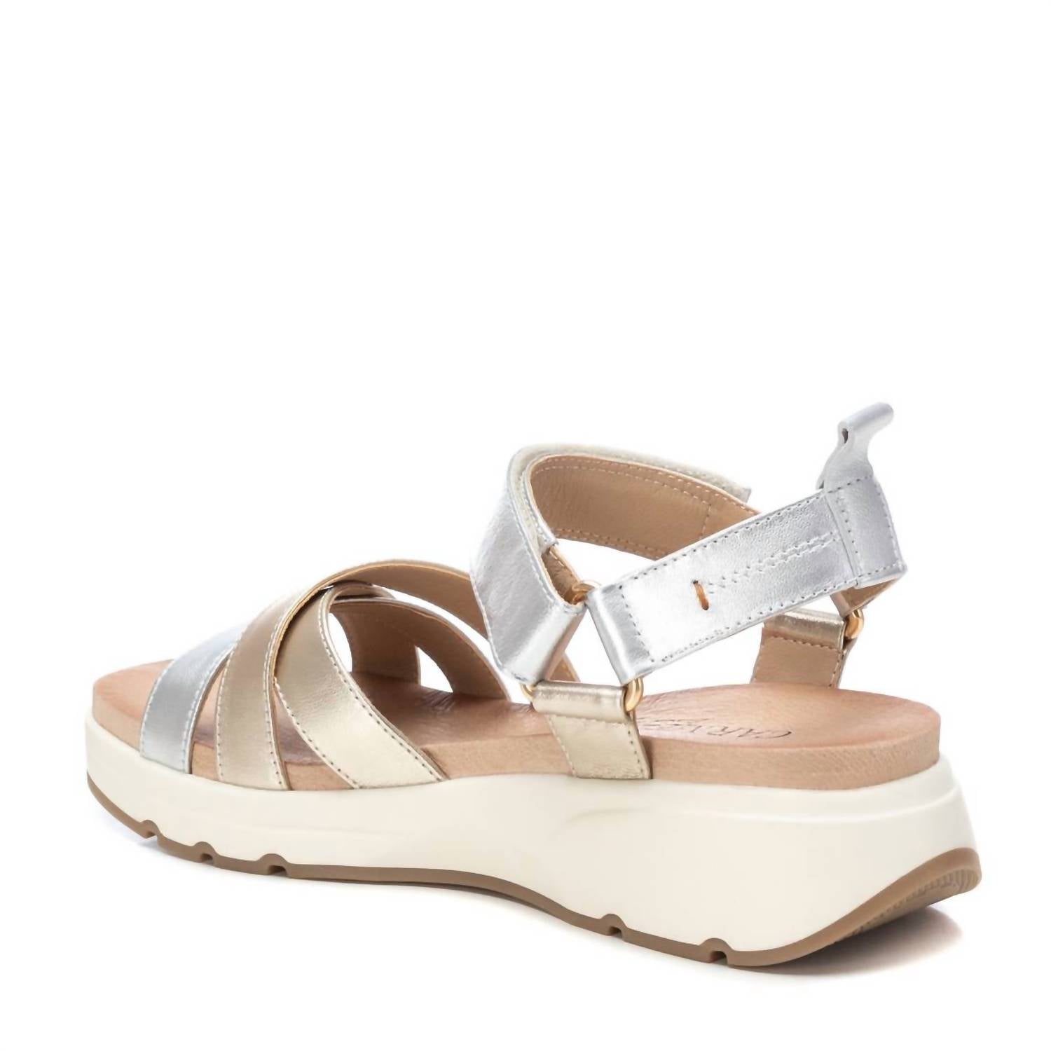 Classicly cute and all-day-wearable. We love this sandal. Elevate your summer wardrobe with the Women's Leather Sandals by Xti, a perfect blend of style and comfort. Featuring a wedge heel and round toe, these sandals are crafted from high-quality leather for durability and a luxurious feel. The metallic finish intertwined straps add a touch of sophistication, complemented by a convenient Velcro fastening and rear puller. Designed for the modern woman, these sandals from the Carmela Collection ensure you step out in style this season.