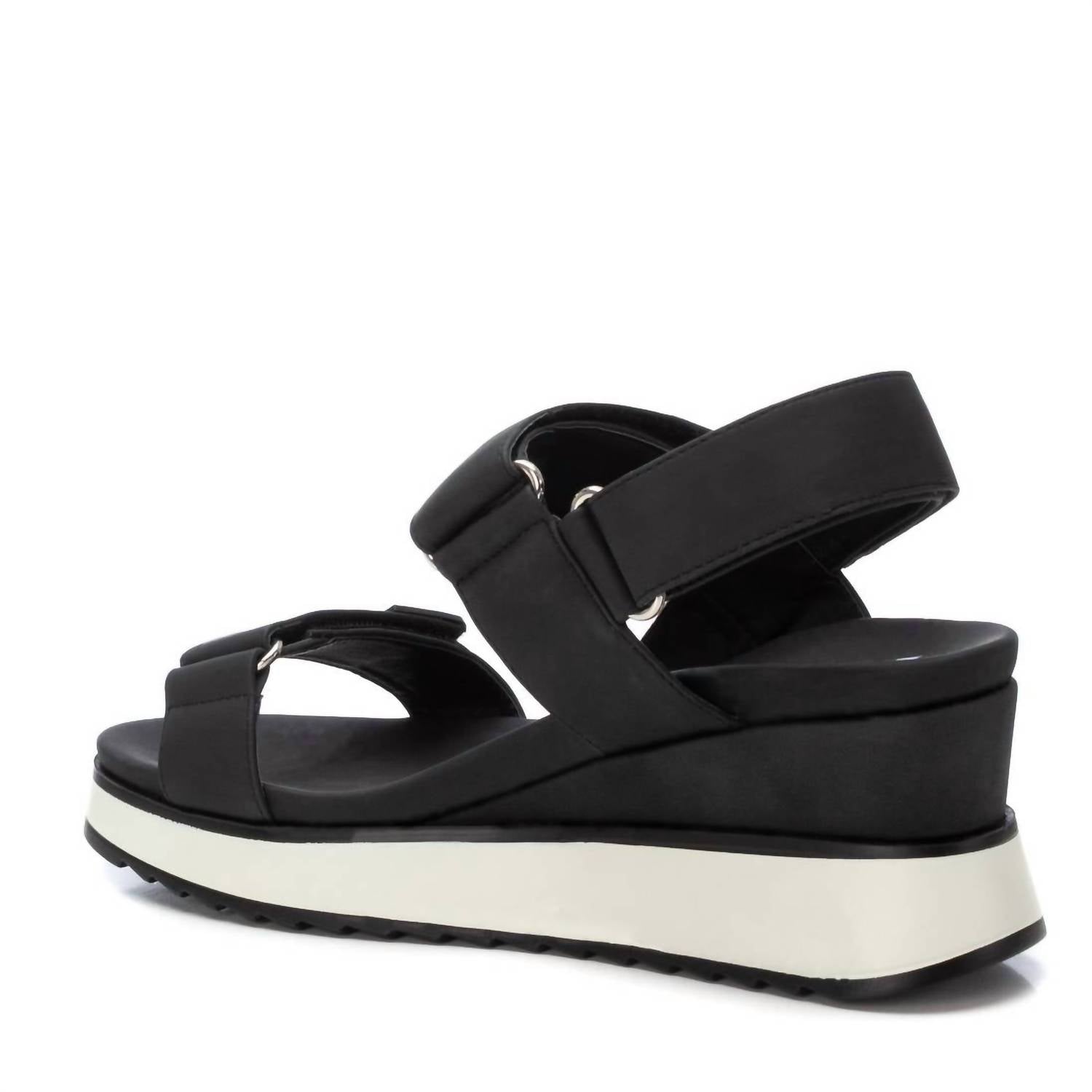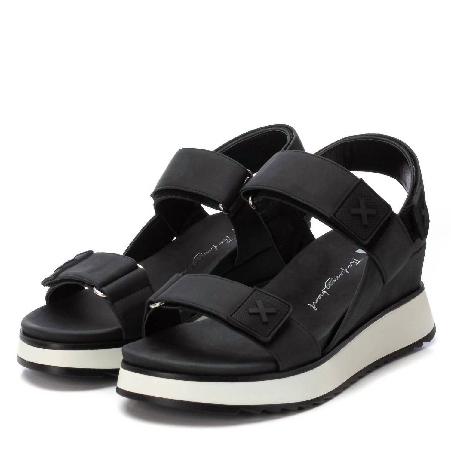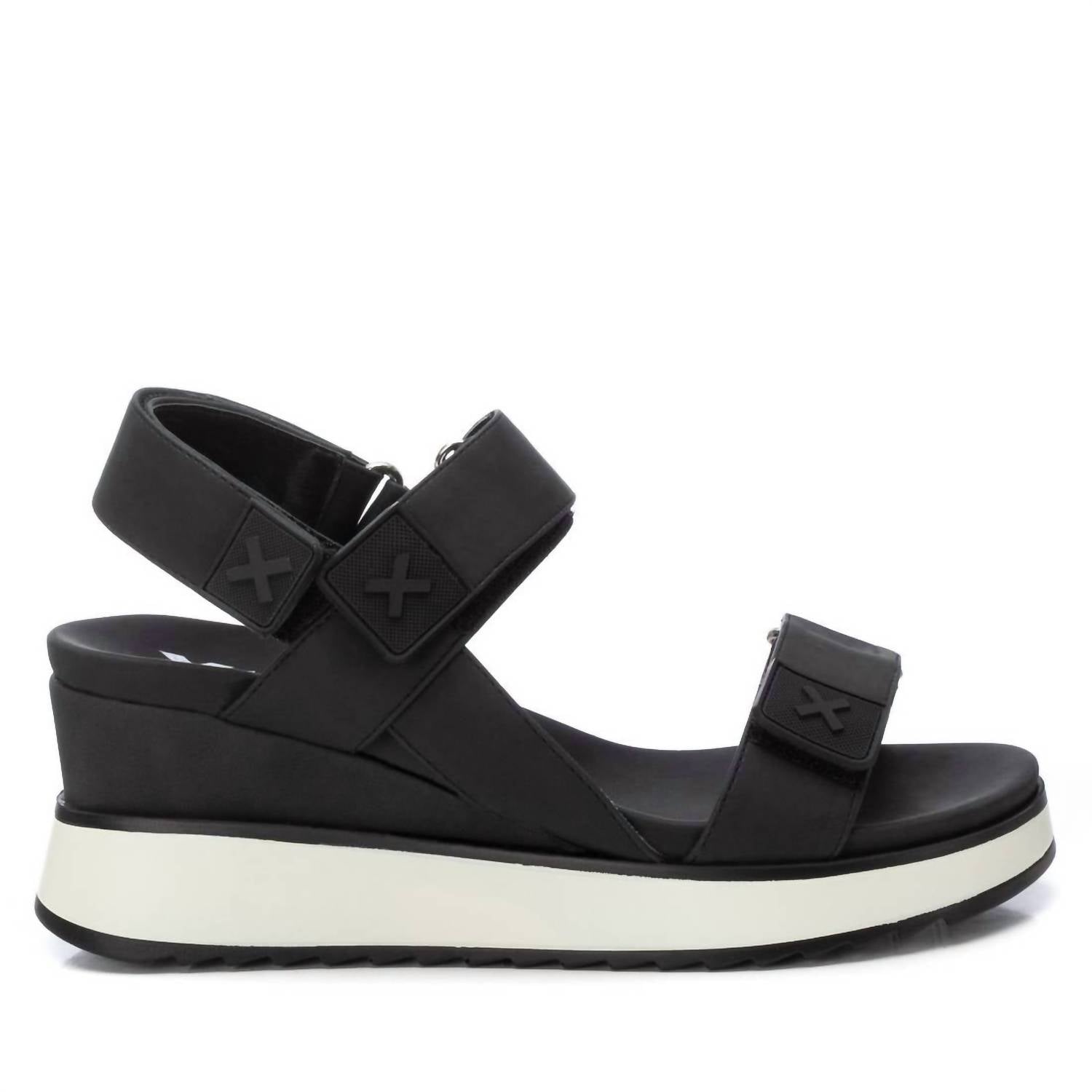 Introducing the Women's Suede Wedge Sandals by Xti, a perfect blend of comfort and style for any occasion. These wedges feature an open toe design and a chic wedge heel, making them a versatile addition to your wardrobe. Available in classic black, these sandals are designed for adult women who appreciate fashionable footwear. Effortlessly elevate your outfit whether heading to work or enjoying a night out with friends.