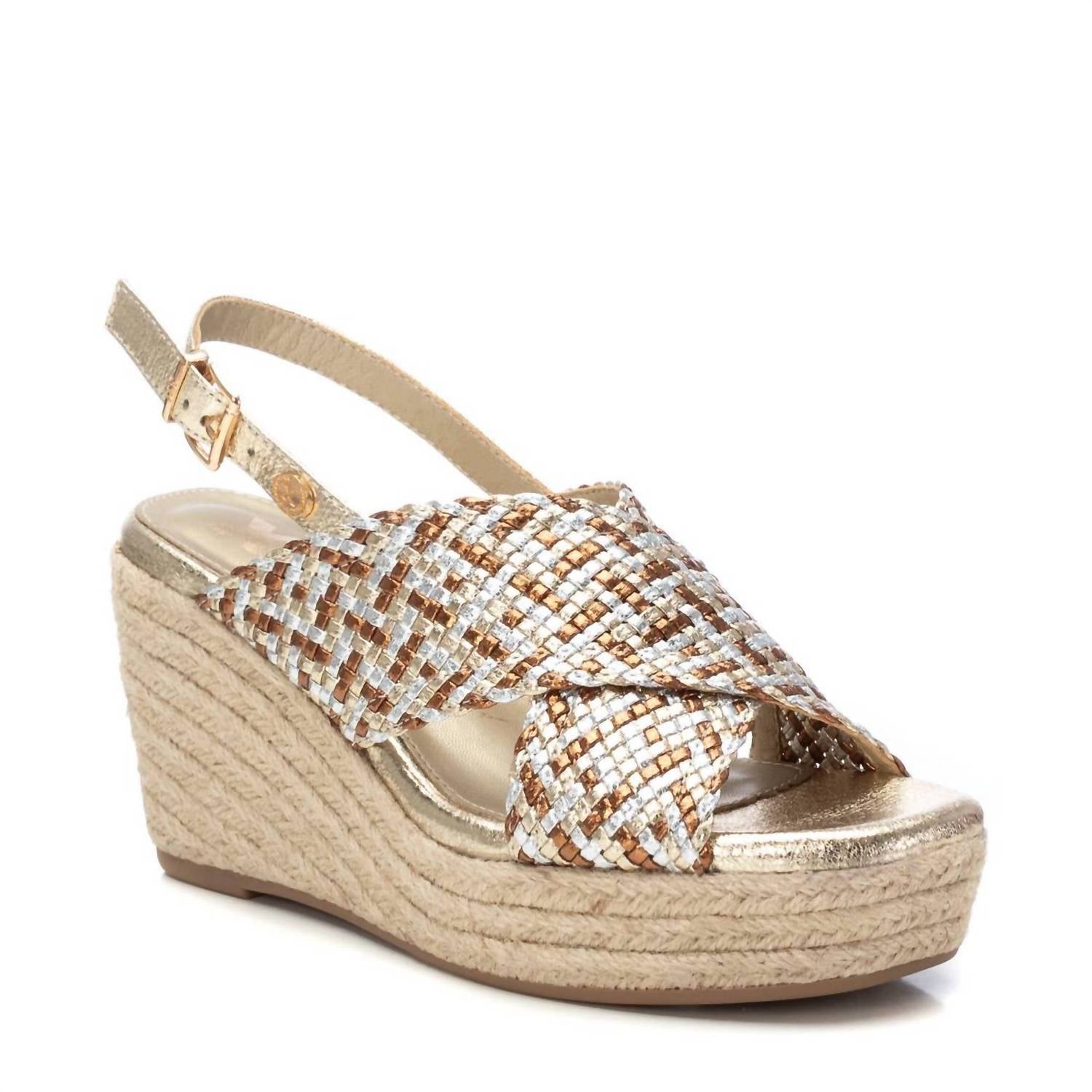 Elevate your ensemble with the Women's Wedge Sandals by Xti, featuring a chic gold hue. Designed with an open toe shape and wedge heel, these sandals are the perfect blend of comfort and style for any occasion. Crafted to add a trendy touch to your outfit, they ensure you look and feel your best, whether at work or out with friends. Perfect for the modern woman seeking both fashion and functionality.