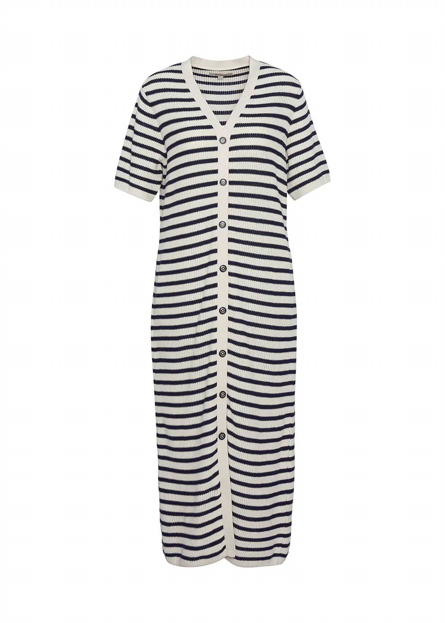 Introducing the Barbour Isla Knitted Midi Dress, a stylish addition to your summer wardrobe crafted with 100% cotton for maximum comfort. This women's dress features short sleeves, a flattering V-neckline, and a slimming shirt silhouette adorned in a timeless monochrome stripe. Perfect for casual outings, the ribbed knitted cotton adds a touch of texture, while the button front closure ensures easy wearability. Care instructions recommend machine washing to maintain the integrity of this multi-stripe piece.