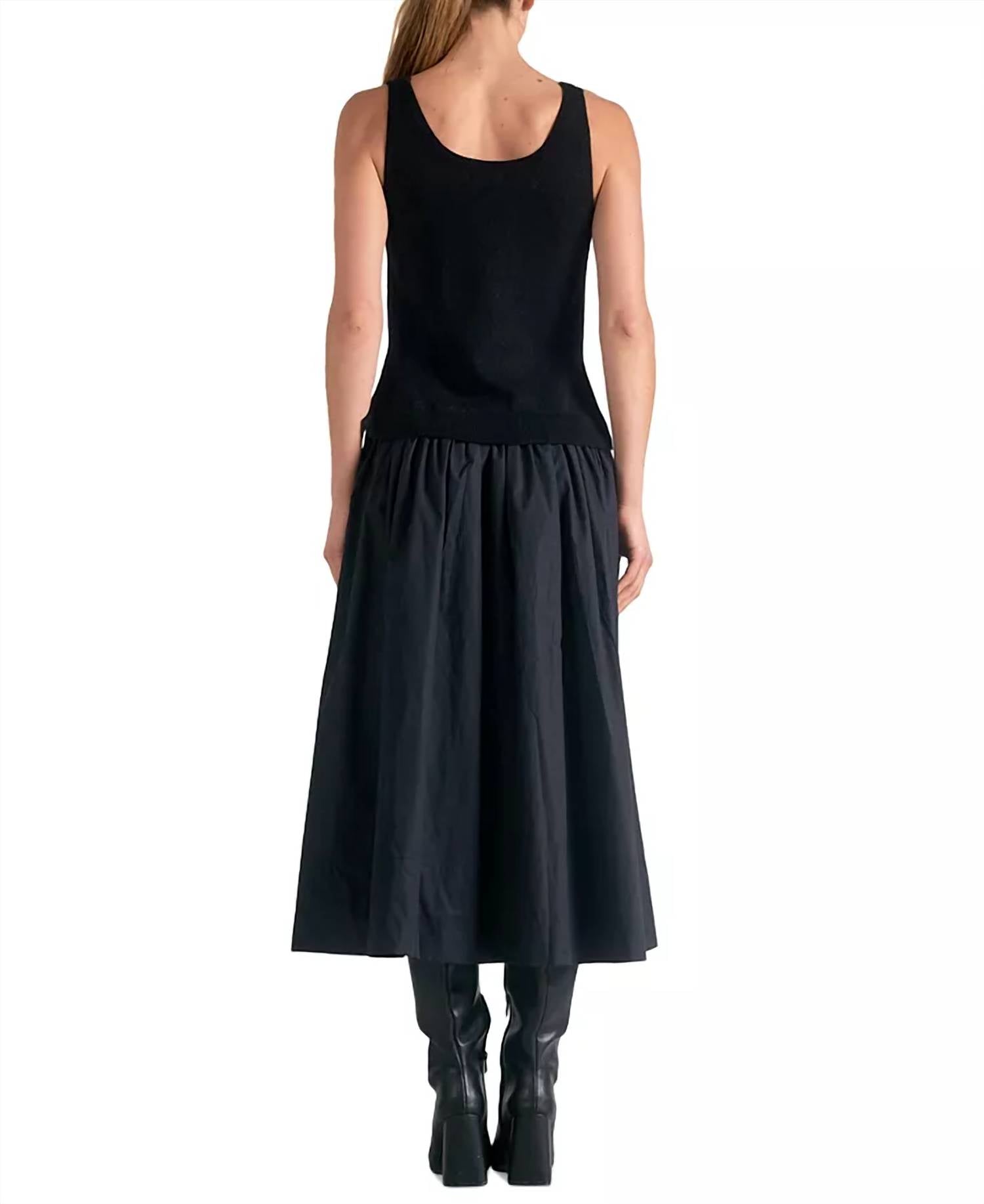 Introducing the ELAN Mixed Textile Ariel Midi Dress, a sophisticated choice for any dinner party. This sleeveless dress showcases a unique combination of a knit tank top and a cotton A-line skirt, highlighted by its convenient on-seam side pockets. Made from a nylon blend, it features a scoopneck design and a pull-on closure for easy wear. Hand wash for best results. Available in a minimalist solid black, perfect for fall and Thanksgiving events.
