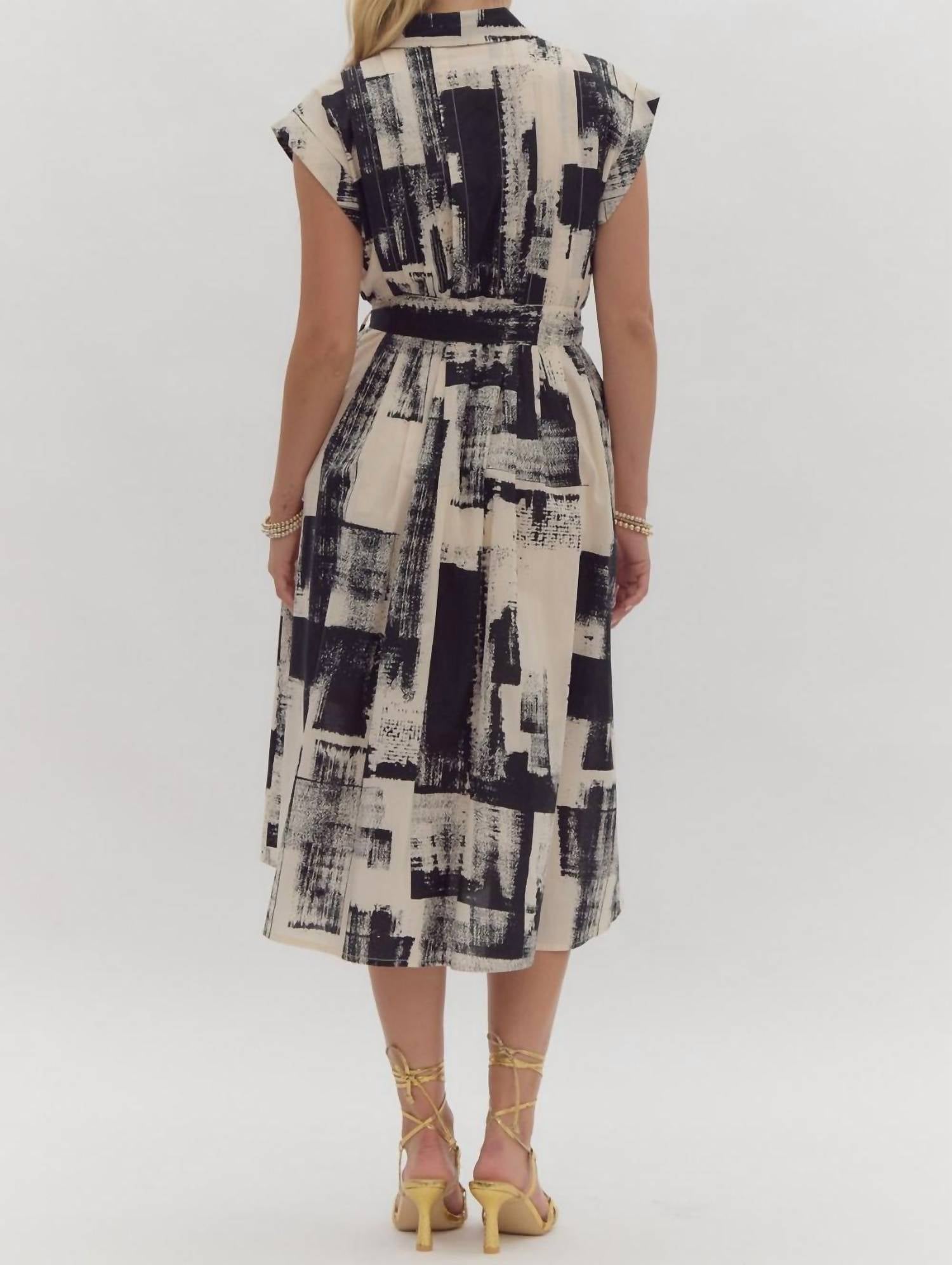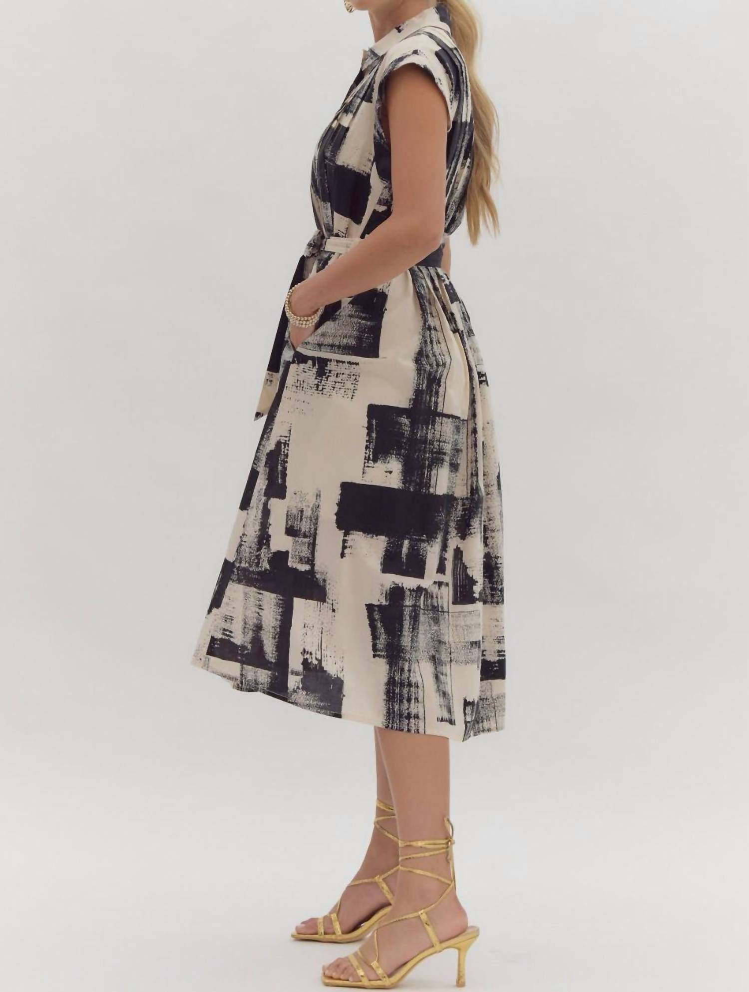 Discover the Abstract Print Midi Shirt Dress by Entro, a stunning addition to your Summer wardrobe. This dress features cap sleeves and is crafted with a loose-fit silhouette, complete with a collar neckline and a self-belt to accentuate your shape. This graphic print shirt dress includes side pockets for added convenience and a half-button closure for easy wear. Care instructions: Hand wash and line dry.