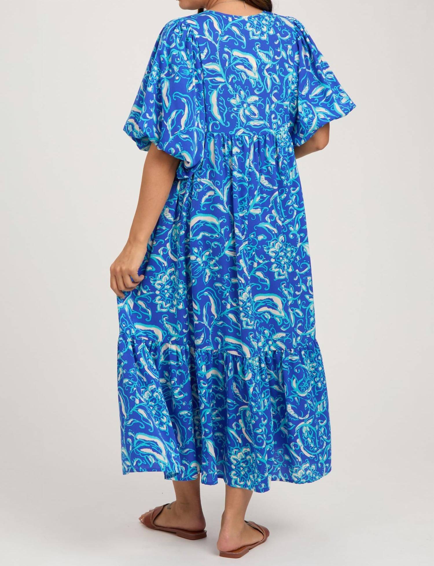 Introducing the Beachside Dress by Entro, a perfect choice for a casual beach day or a relaxed summer outing. This women's midi dress showcases a boho chic look with its patterned blue fabric and shift silhouette, designed with short sleeves and a flattering V-neck. Made from polyester, it features convenient pockets and a zip closure for easy wear. Maintain its charm with hand washing and line drying. Ideal for maternity wear, this dress is designed for comfort while keeping you stylish. Model is 5'2" wearing a size small.