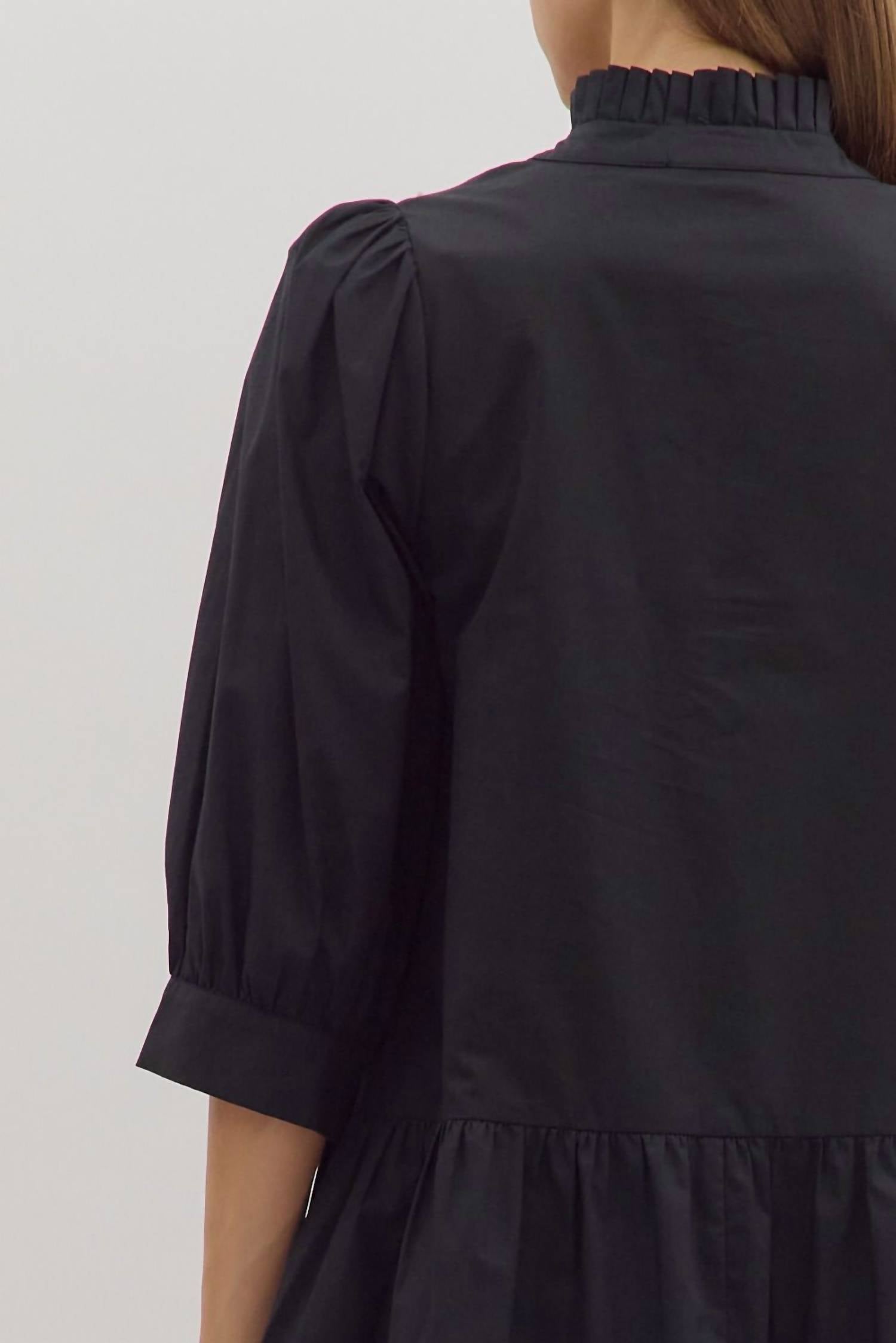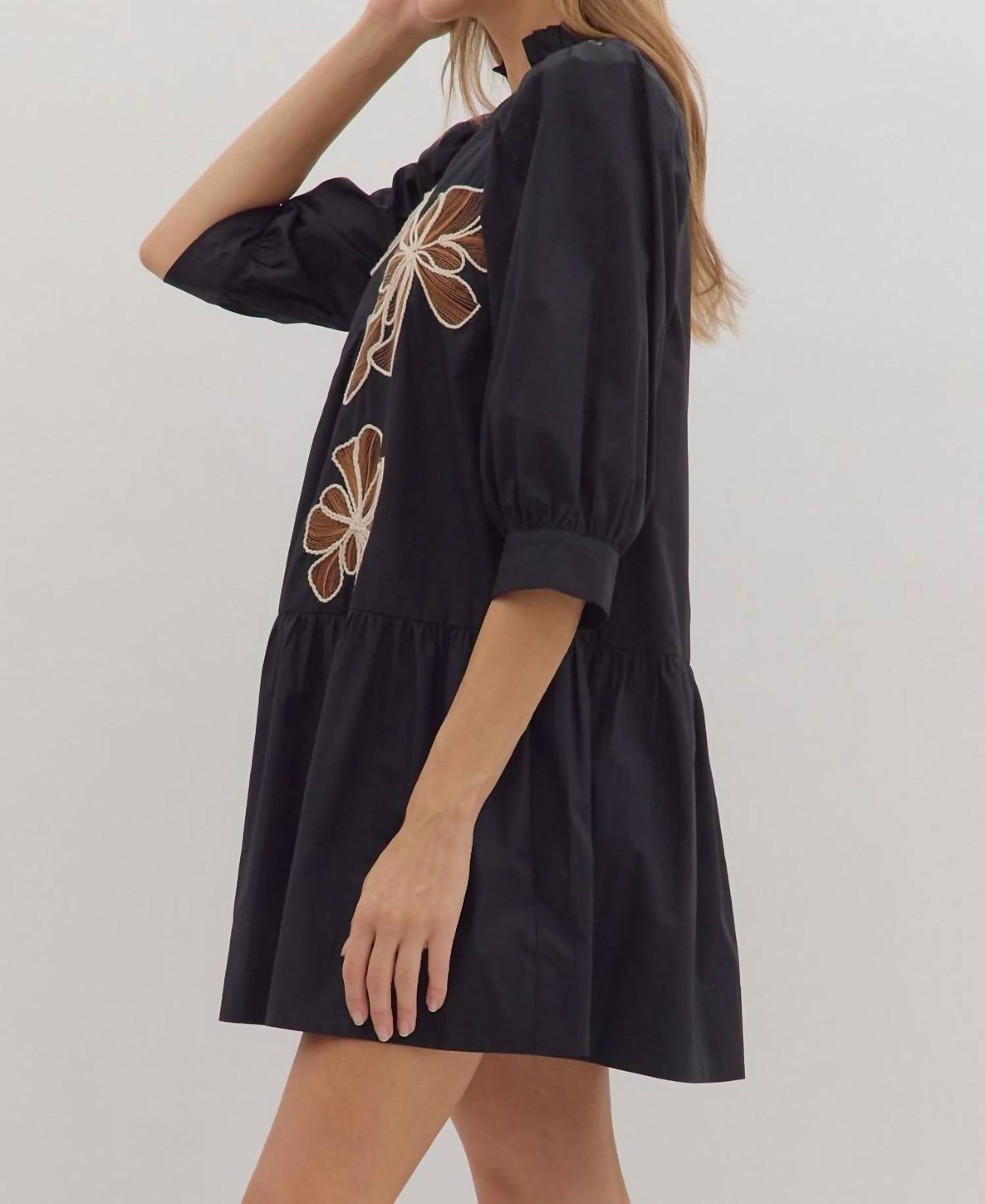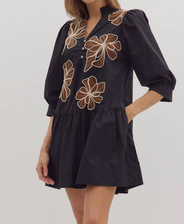 Introducing the Bloom With Grace Floral Dress by Entro, a perfect blend of charm and elegance in black. This mini A-line dress features three-quarter sleeves and delicately embroidered floral details on the front. Made from 100% Cotton with a partial button closure, it adds pockets for convenience. Care instructions: Hand wash and lay flat to dry. Ideal for both casual outings and special occasions, making it an essential addition to your spring wardrobe.