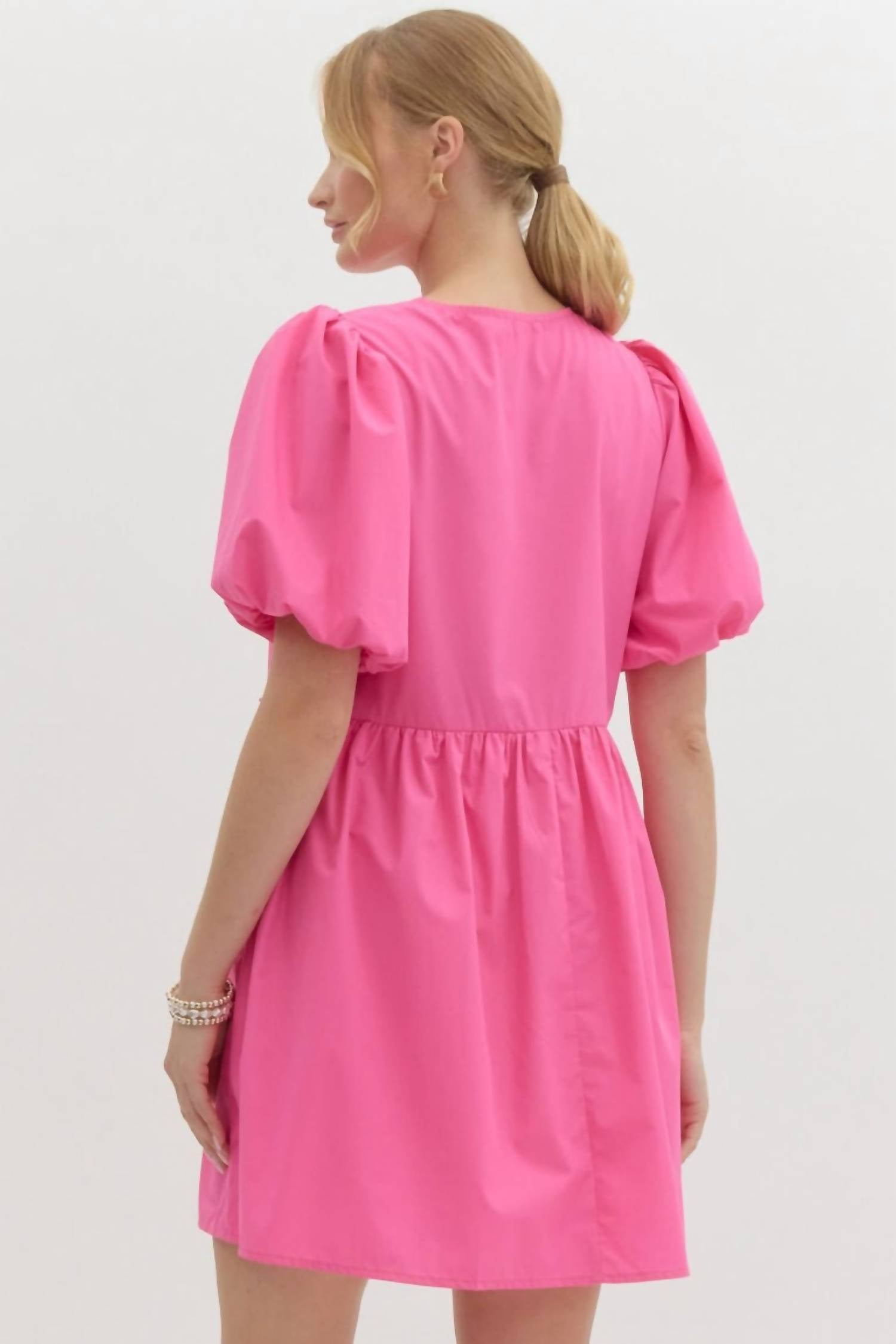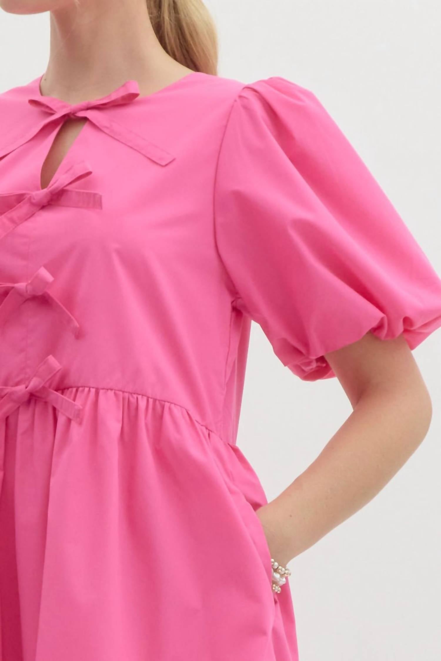 Step into summer with the Bow Dress by Entro, a vibrant hot pink mini designed for a minimalist look. Featuring short bubble sleeves and an elegant ribbon detail at the front, this dress is crafted from a lightweight blend of 80% polyester and 20% cotton. With a convenient pull-on closure, elasticized cuffs, and practical side pockets, it's both stylish and functional. Care is simple: machine wash and tumble dry.
