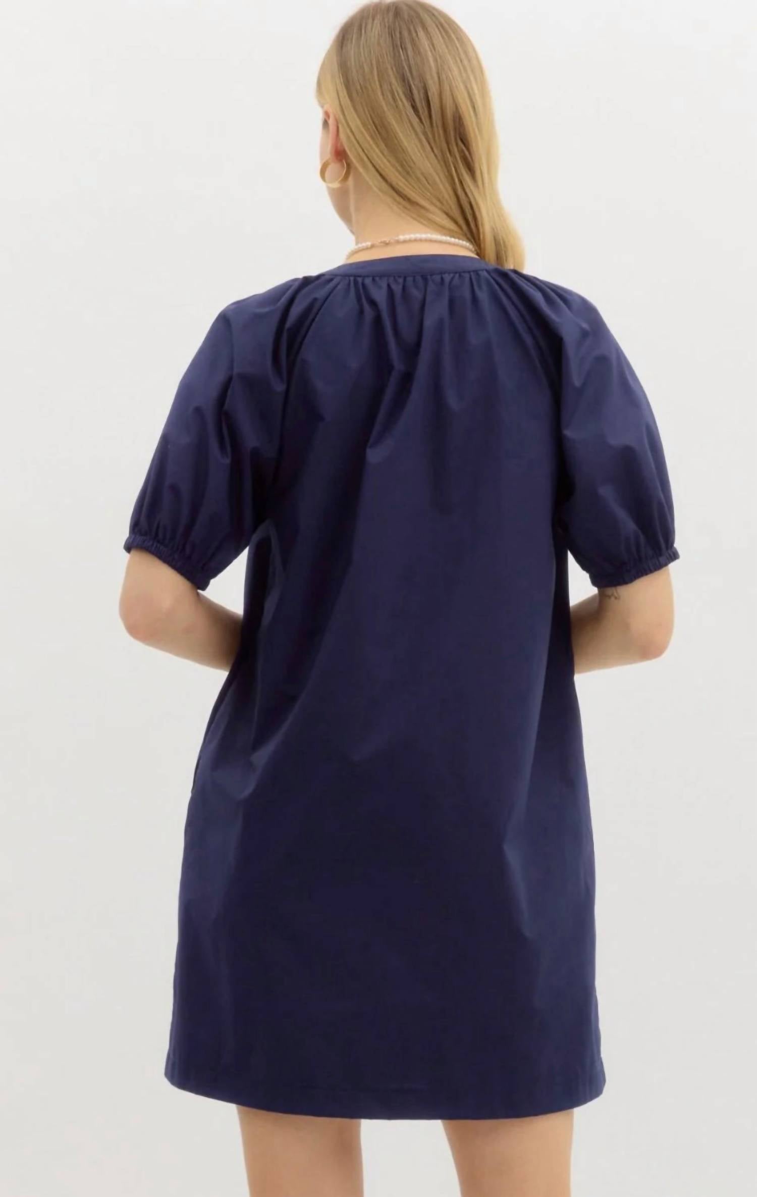 Embrace effortless style with the Cape Mini Dress by Entro in navy, a perfect pick for warm weather days. This shift dress features short puff sleeves and an embroidered front detail, adding just the right touch of flair. Made from a lightweight cotton blend and tailored for a relaxed fit, it includes handy side pockets for convenience. Closure: Button closure. Care: Machine wash, line dry. Available in sizes with a bust of 40" to 44" and lengths ranging from 34.5" to 35.5".