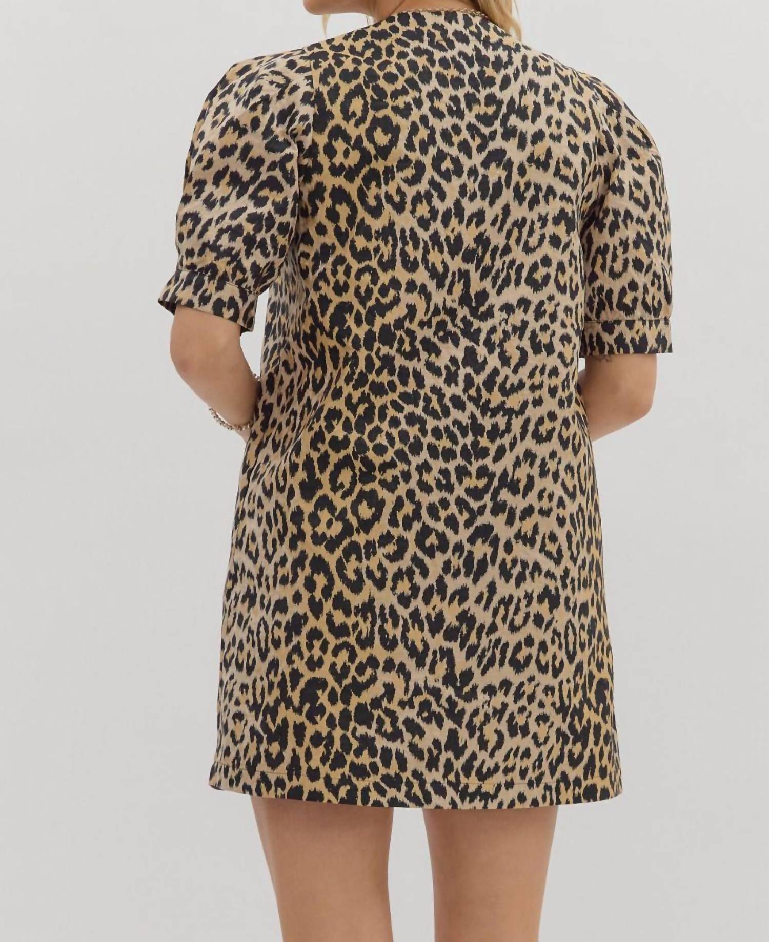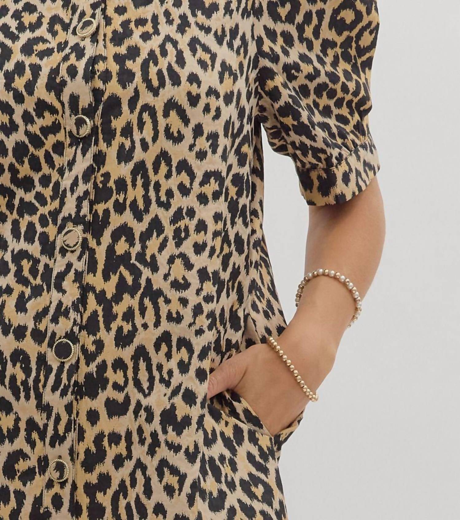 Meet the Chasing Dreams Leopard Print Dress by Entro, a captivating vacation-ready piece in a taupe animal pattern that embodies maximalist trends. Crafted from 100% polyester, this mini-length shift dress features short sleeves and convenient side pockets. The pleated design with a crewneck is finished with chic gold-rimmed button front closure. With its cuff band detail, this piece is perfect for summer outings, emphasizing both style and functionality.