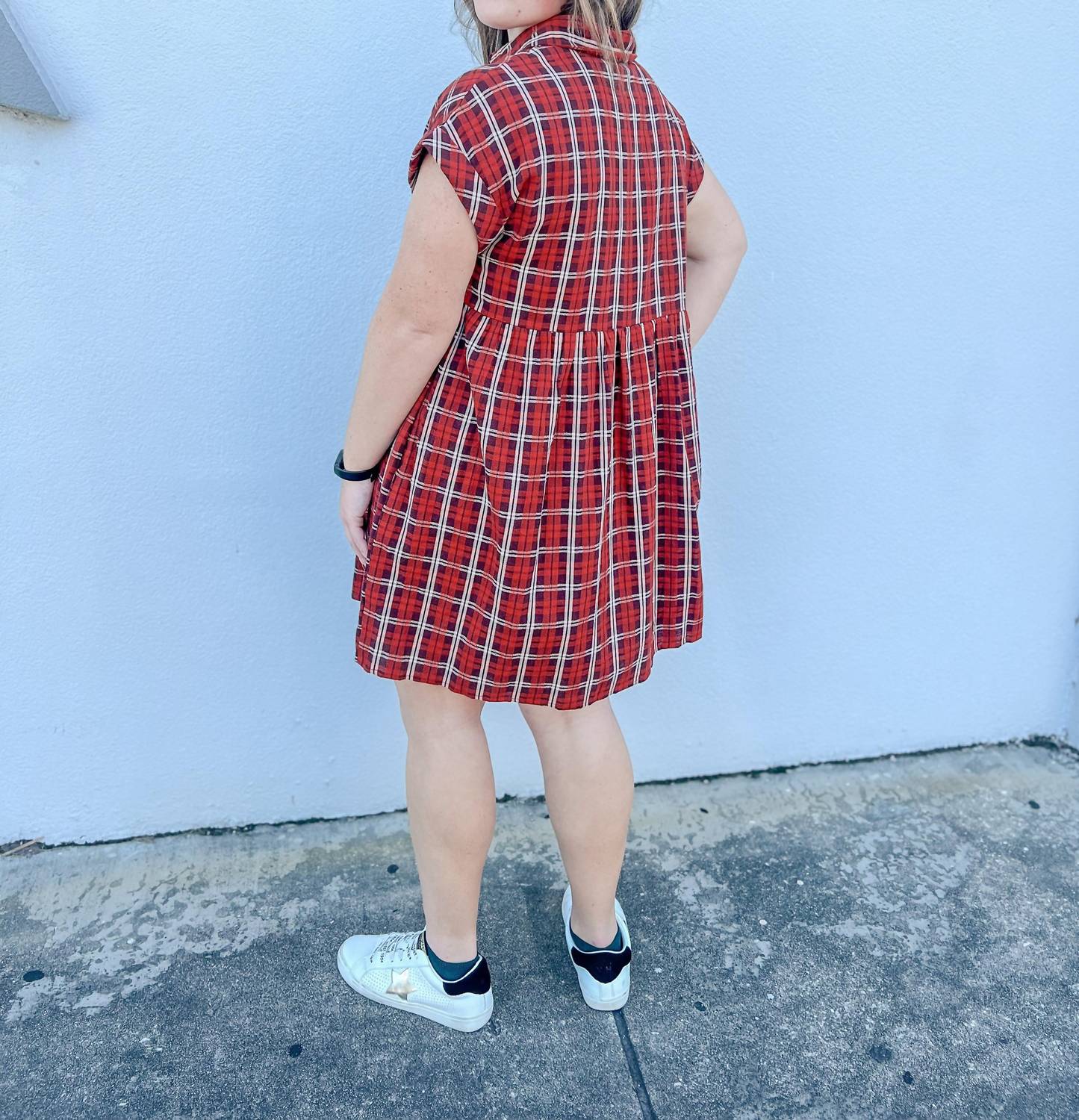 The Classic Charm Plaid Mini Dress by Entro combines timeless style with contemporary design, perfect for versatile day-to-day wear. This short sleeve dress is crafted from breathable 100% cotton with a classic red plaid print. It features a crisp collared neckline, practical side pockets, and a convenient button closure. Designed with slightly oversized fit, this dress gives you confidence with its woven, lined fabric. Model Lauren is 5'3" and size 8, wearing a small.