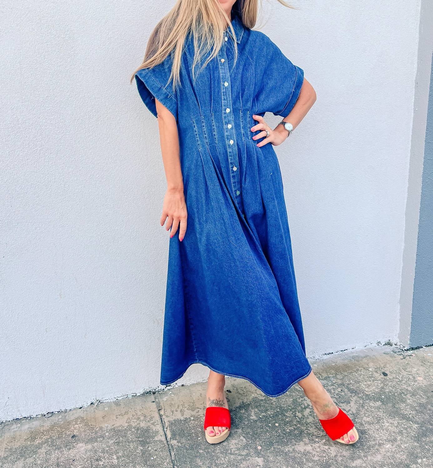 Your new favorite denim dress has arrived! This midi-length beauty is the perfect mix of casual charm and effortless style. Whether you’re dressing it up with heels or keeping it laid-back with sneakers, this dress is a closet must-have! ✨ Features You'll Love: ✔ Collared neckline – A polished touch for an elevated look ✔ Short cap sleeves – Just the right amount of coverage ✔ Button-front design – Style it your way—wear it buttoned up or layer it over a tank ✔ Medium wash denim – A versatile hue that pairs with anything ✔ Flattering midi length – The perfect balance of classy & comfortable ✨ Soft, breathable fabric for all-day wear ✨ Effortless styling – just add your favorite accessories! 📝 Fit Notes: Lala is 5'6", wears a size 0, and is modeling a Small. Fit is true to size. 🧵 Fabric: 75% Cotton, 23% Polyester, 2% Spandex – A perfect blend for comfort & stretch 🧦 Care: Hand wash cold, line dry From brunch dates to weekend errands, this denim midi dress is your go-to for easy, stylish dressing. Add it to your cart before it’s gone! 🛍️🔥