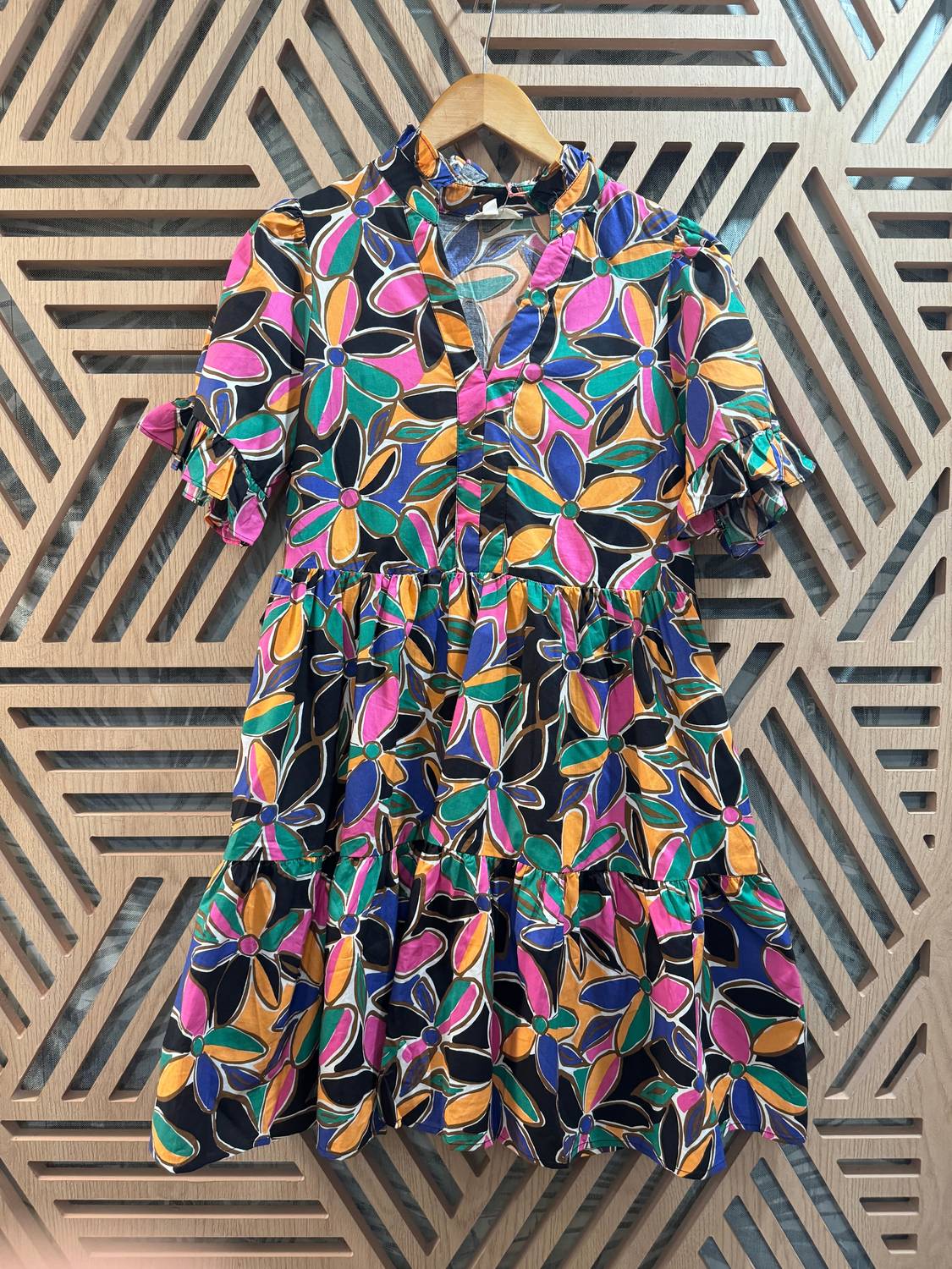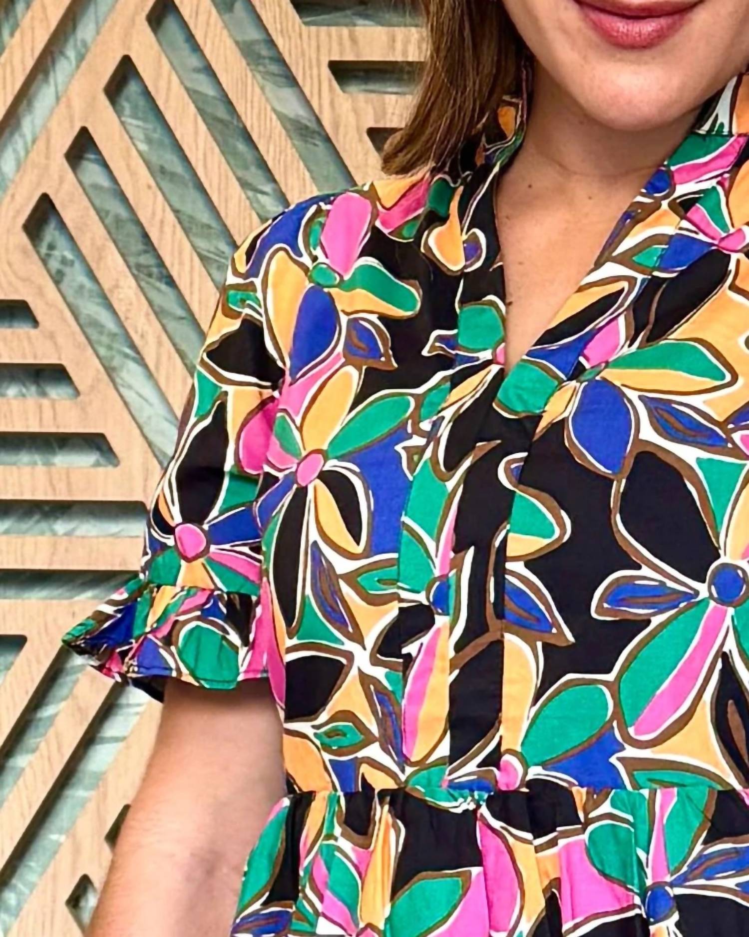 Introducing the Colorful Flowers Short Dress by Entro, a perfect choice for a vibrant summer look. Crafted from 100% cotton, this patterned mini dress features a flattering V-neck and convenient pockets, all in a shirt silhouette. The pull-on design makes it an easy go-to for workwear or a Mother's Day celebration. For care, simply hand wash and enjoy the comfort and style this dress brings.