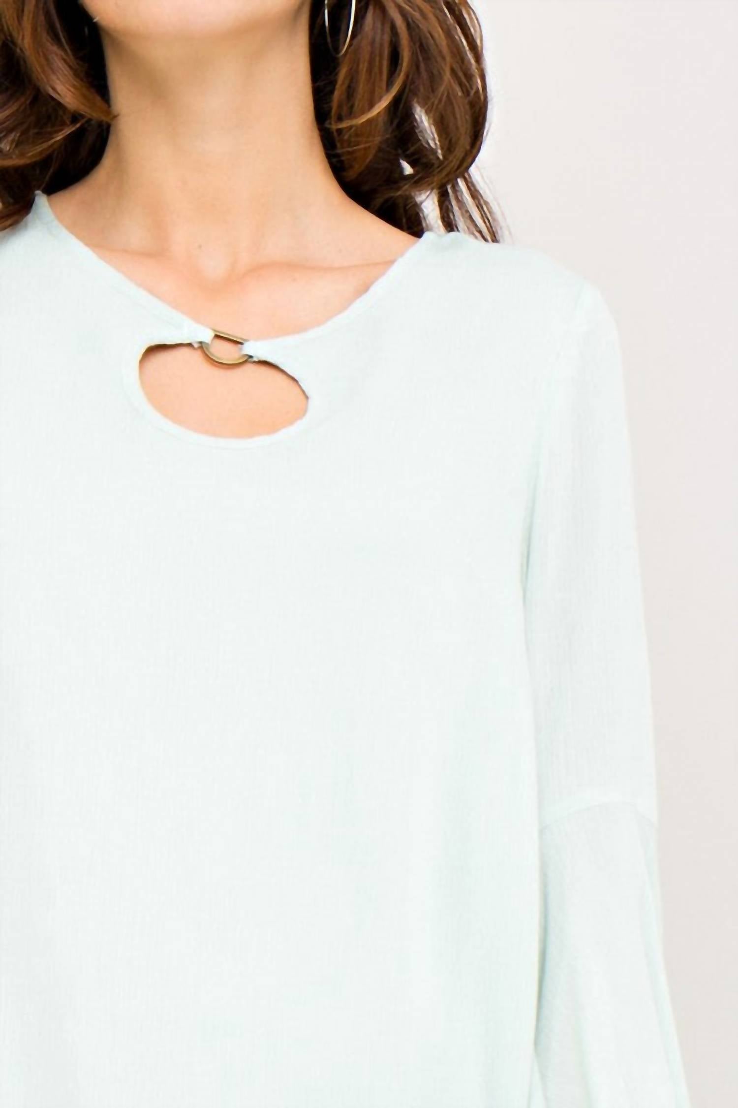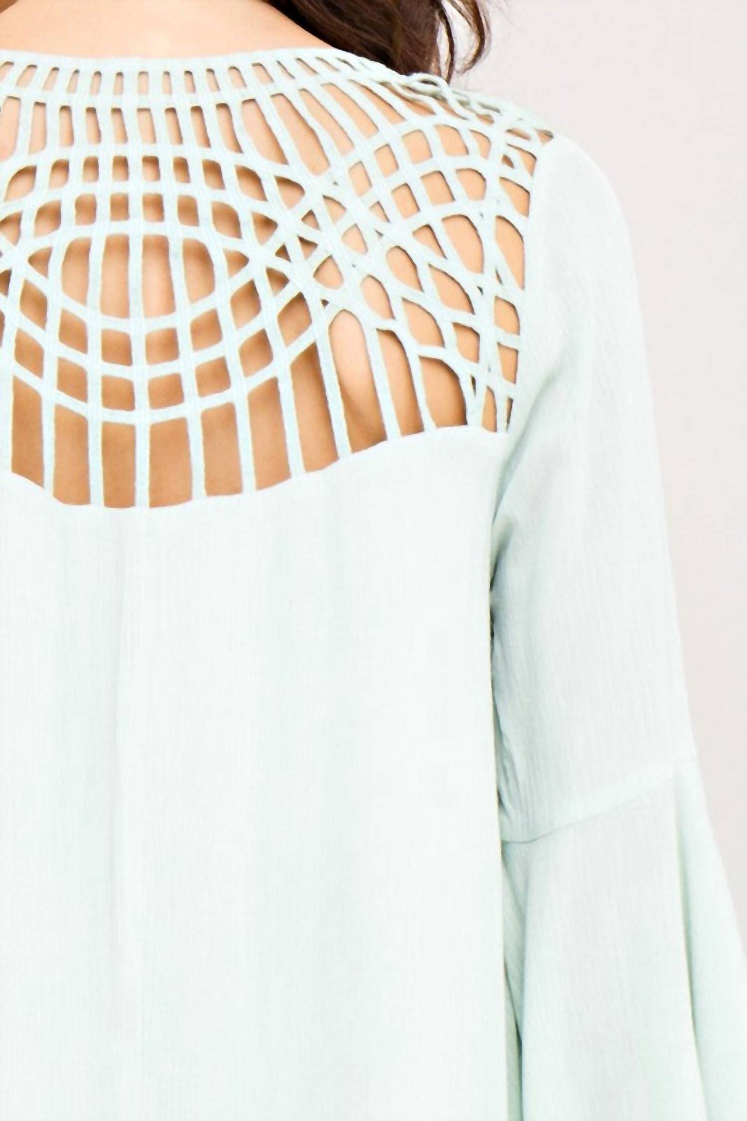 Meet the Crochet Back Mini Dress by Entro, a stunning piece for the fashion-forward. This design features intricate three-quarter sleeves and a chic crewneck, crafted in a textured sage hue for a fresh look. The dress boasts an airy A-line silhouette with a stylish front cutout accented by a brass ring, complemented by an openwork crochet back. Its pull-on closure offers effortless elegance, although specific care instructions are unlisted, so handle with care.
