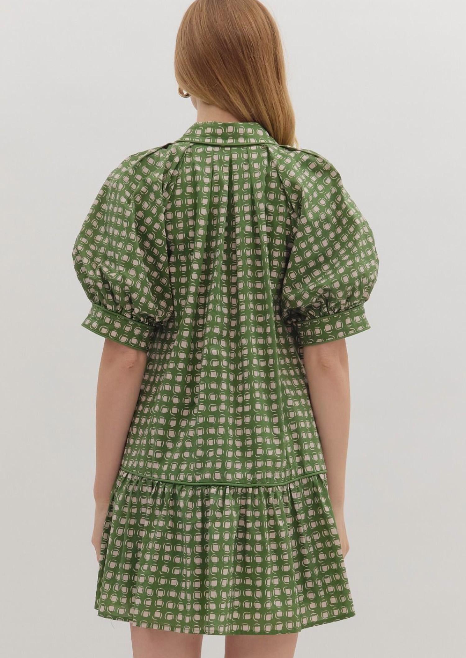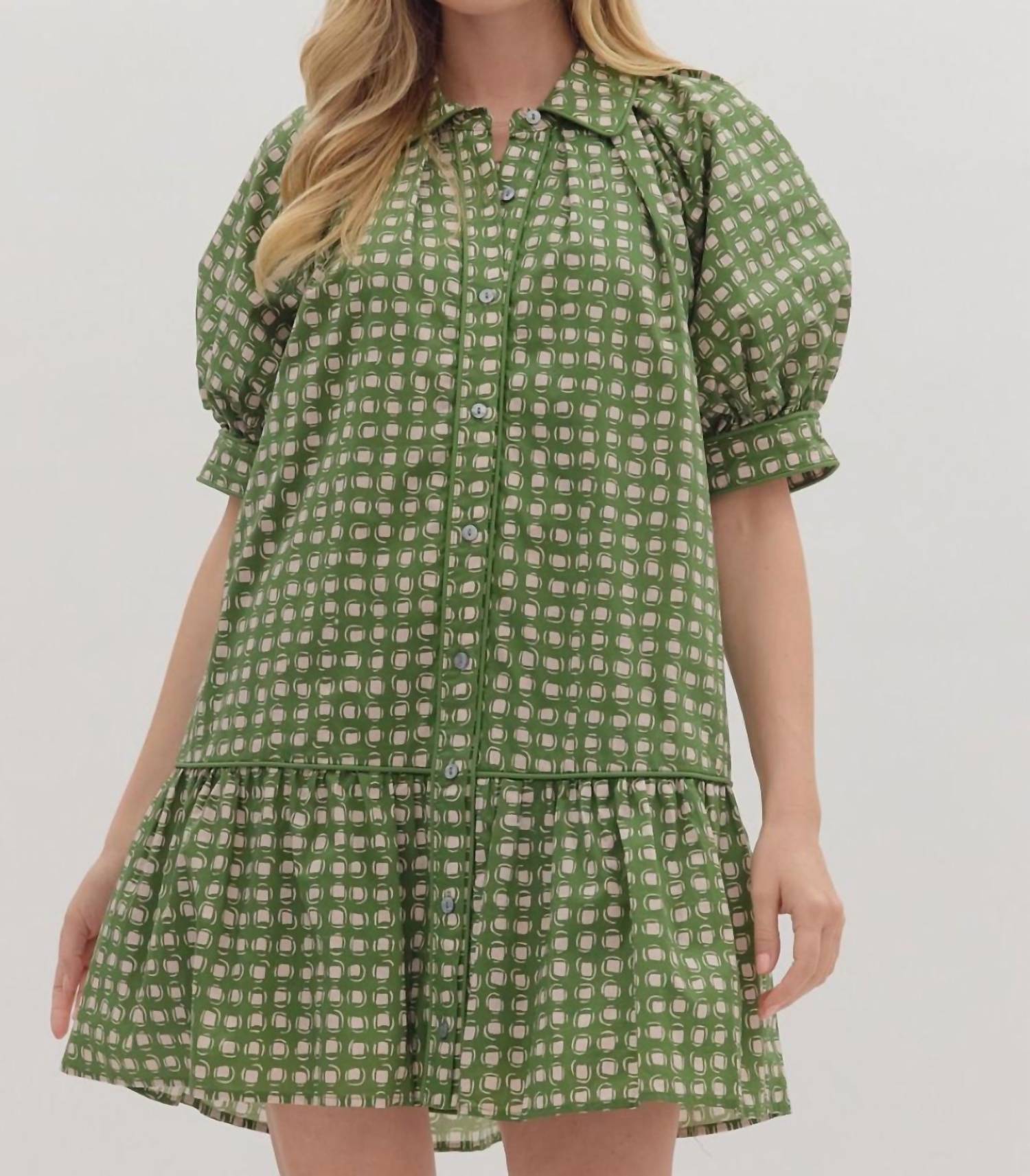 The Cubes Dress by Entro is a chic option for those looking to embrace 90s fashion with a modern twist. This green mini shift dress features short puff sleeves and a geometric print, perfect for a summer vacation. Crafted from 100% cotton, it offers lightweight comfort and is lined for extra coverage. Closure is via buttons at the front, complete with a practical pocket at the side and a stylish shirt collar with a ruffle hem.