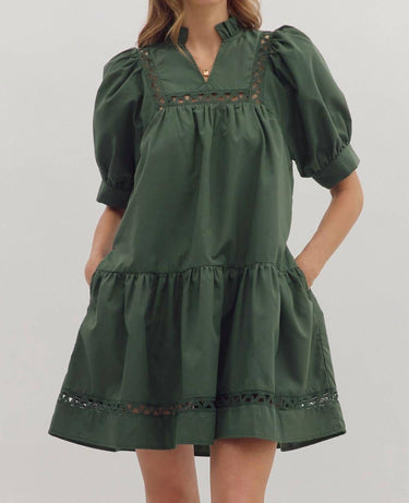 Transform your wardrobe with the Cuff Sleeve Trim Accent Ruffle Mini Dress by Entro, a chic addition to any summer ensemble. Featuring short sleeves and a flattering A-line silhouette, this solid pine-colored dress boasts elegant scallop trim inset at the yoke and skirt. Made from 100% polyester, it offers side pockets for added convenience. With a pull-on closure, it's perfect for occasions like a baby shower or St. Patrick's Day, embodying a boho chic trend.