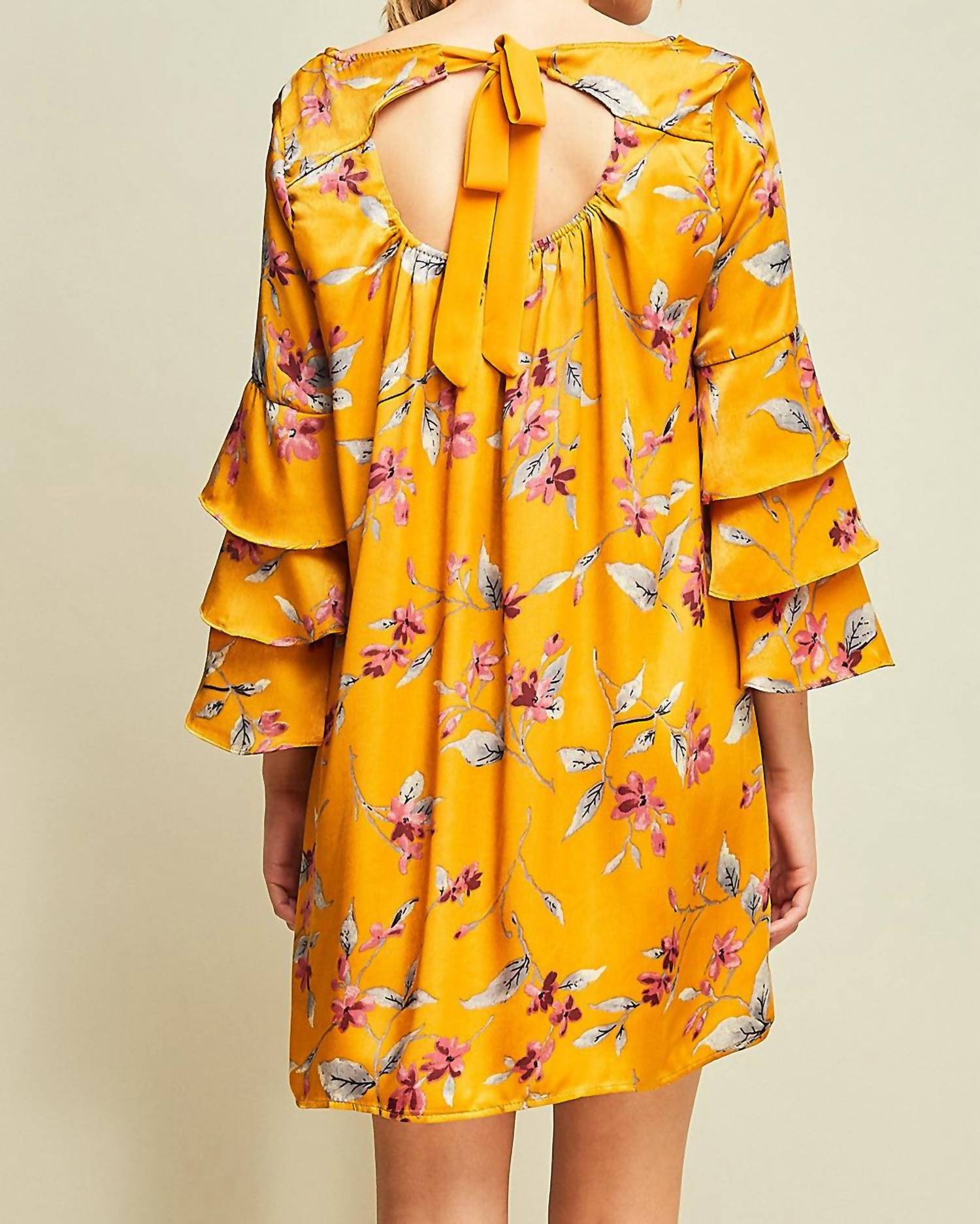 Introducing the Floral and Ruffle Sleeve Dress by Entro, a playful addition to your wardrobe perfect for a beach day. This mini dress features long 3/4 ruffled sleeves and a charming V-neckline. Crafted from 100% polyester, it includes an elasticized cutout back with a tie closure for a flirty touch. Originating from overseas, this dress is fully lined, lightweight, and best cared for by hand washing cold. Available in a vibrant multi-color pattern, the dress comes in sizes with a consistent length of 38 inches, with bust measurements varying from 38" in small to 42" in large.