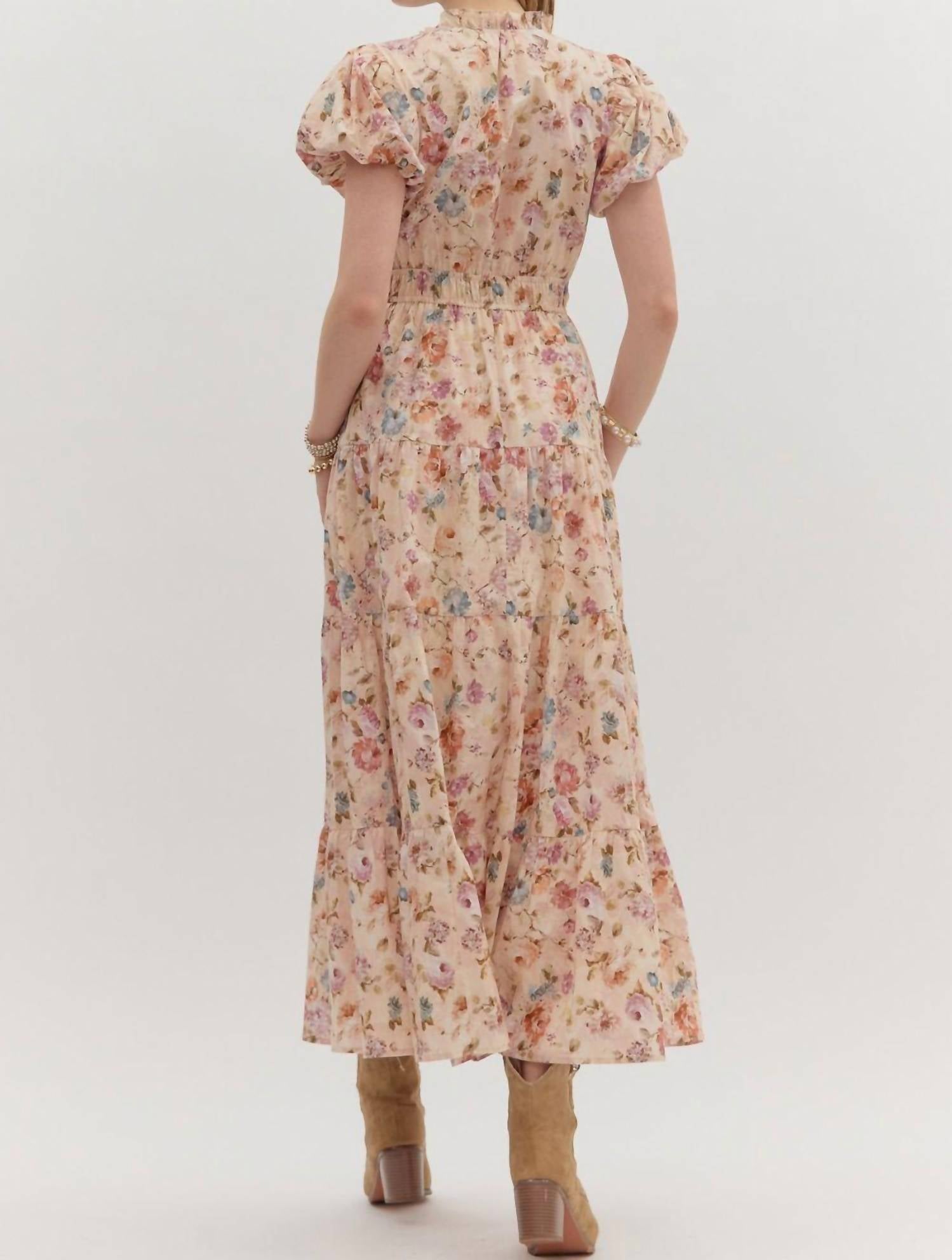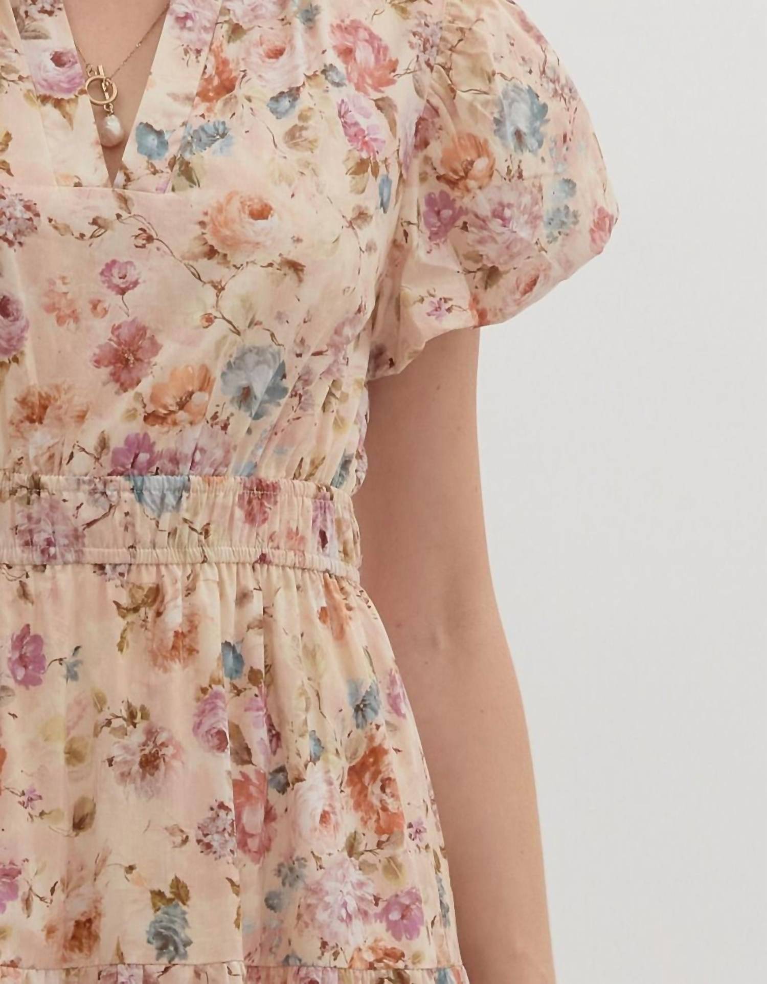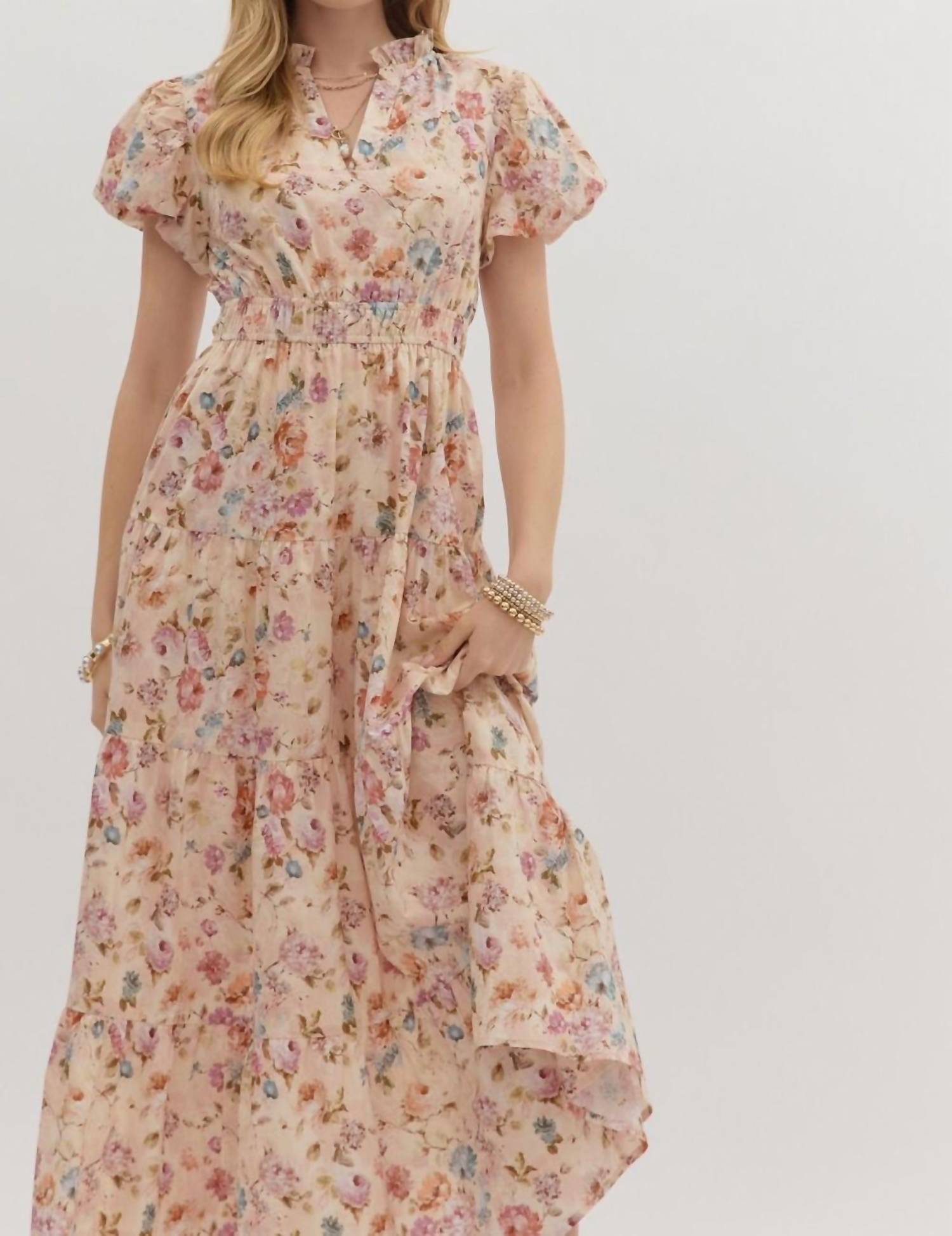 Floral print short bubble puff sleeve pullover midi tiered dress. Double elasticated waist. Lined. Woven. Non-sheer. Lightweight.