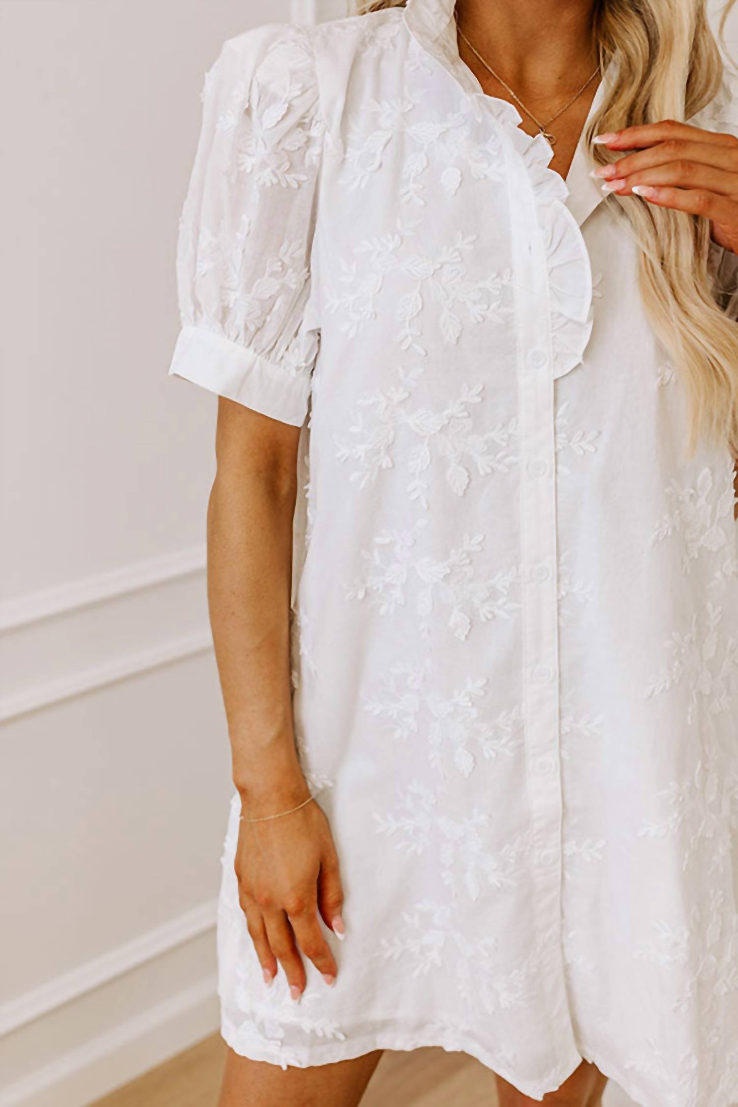 The Floral Embroidered Button Down Dress by Entro is an embodiment of elegance in minimalist style. Featuring short puff sleeves, this crisp white dress is composed of 100% cotton, offering a breathable and light feel for summer occasions. Its mockneck and delicate floral embroidery enhance its sophisticated A-line silhouette, perfectly suited for vacation or understated elegant affairs. The dress includes a button closure and requires hand washing with line drying, ensuring lasting quality.