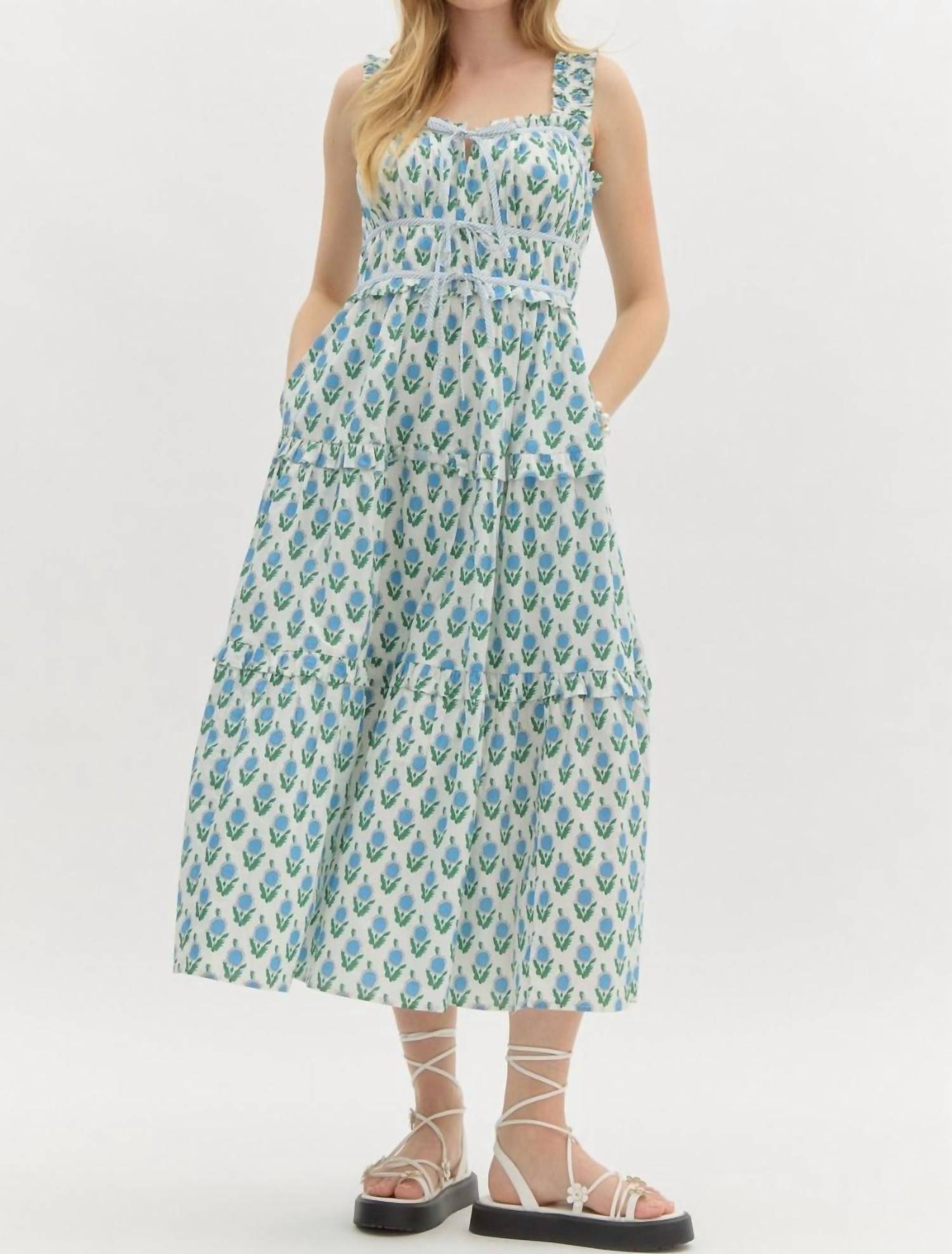 Embrace boho chic style with the Floral Maxi Dress by Entro, crafted for effortless elegance in a refreshing white hue. This sleeveless, A-line dress is made with 100% cotton fabric and features a squareneck, providing comfort and breathability perfect for a summer outing. Its tie closure ensures a customizable fit, and handy pockets add a touch of practicality to this stylish piece. Ideal for a beach day or Thanksgiving gathering, this dress fits true to size, though bustier figures should consider sizing up. Model is 5'2" and wears a size small.