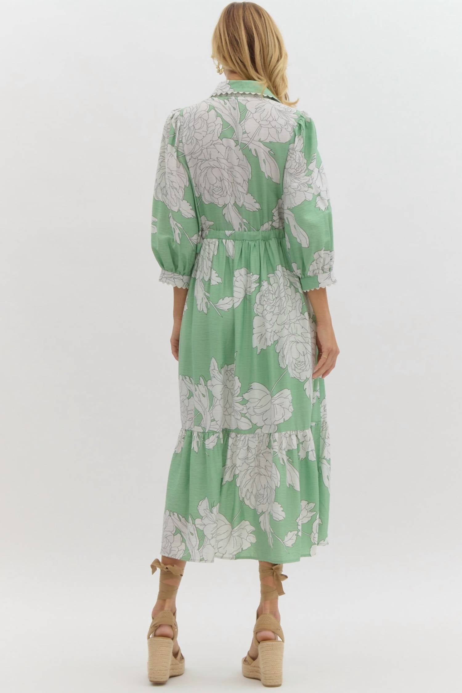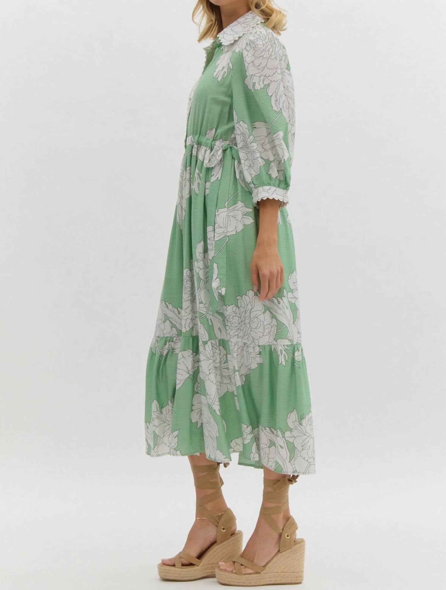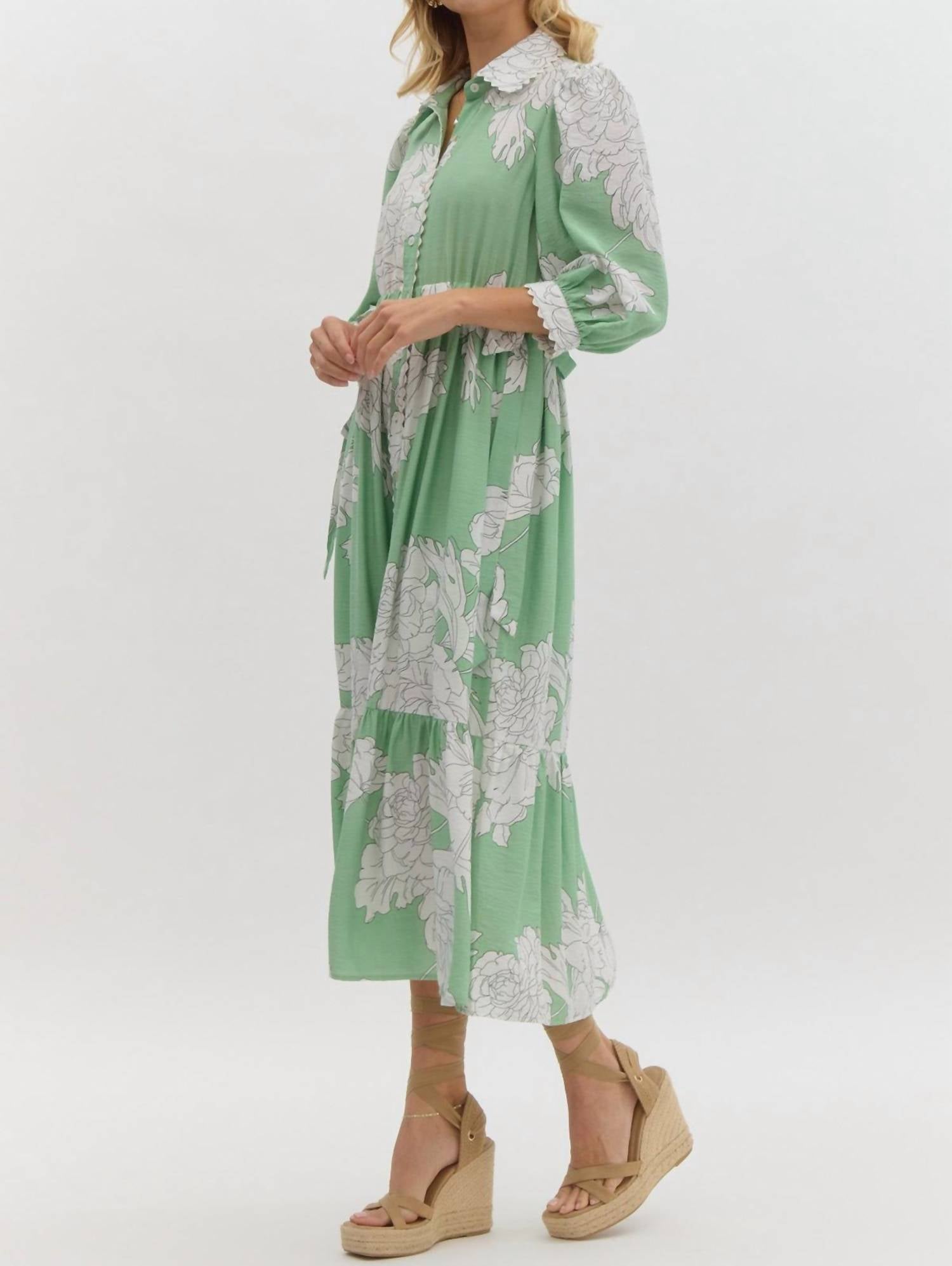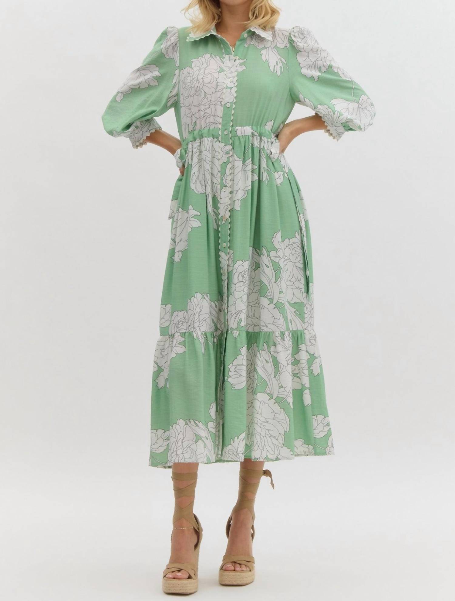Elevate your style with the Floral Midi Dress by Entro, perfect for spring and summer outings in a charming mint hue adorned with oversized peony florals. This dress features long puff sleeves with elastic cuffs and a classic shirt collar, emphasized by a tiered midi silhouette that exudes relaxed elegance. Crafted from 83% Rayon and 17% Nylon, its functional button closure and removable self-tie belt offer a flattering fit. Machine wash and lay flat to dry. It is specially available in plus sizes.