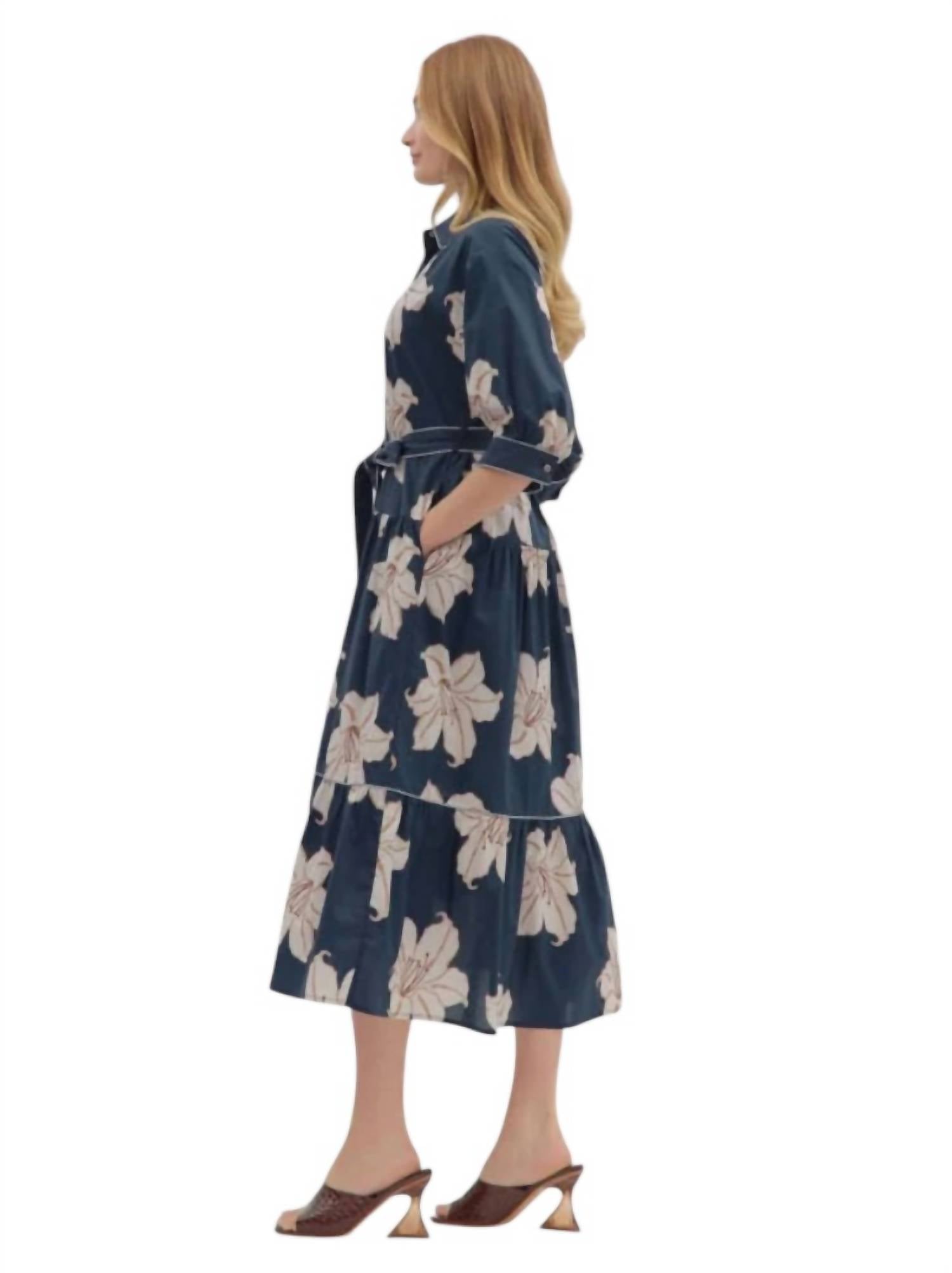 Unveil elegance with the Floral Print Midi Dress by entro, a perfect choice for your vacation wardrobe. This blue, patterned A-line silhouette features 3/4 sleeves and a front button closure, complete with a detachable waist tie belt for customizable styling. The dress has practical side pockets and is fully lined, made from 100% lightweight cotton for breathability. Care instructions are simple: machine wash and line dry for maintenance.
