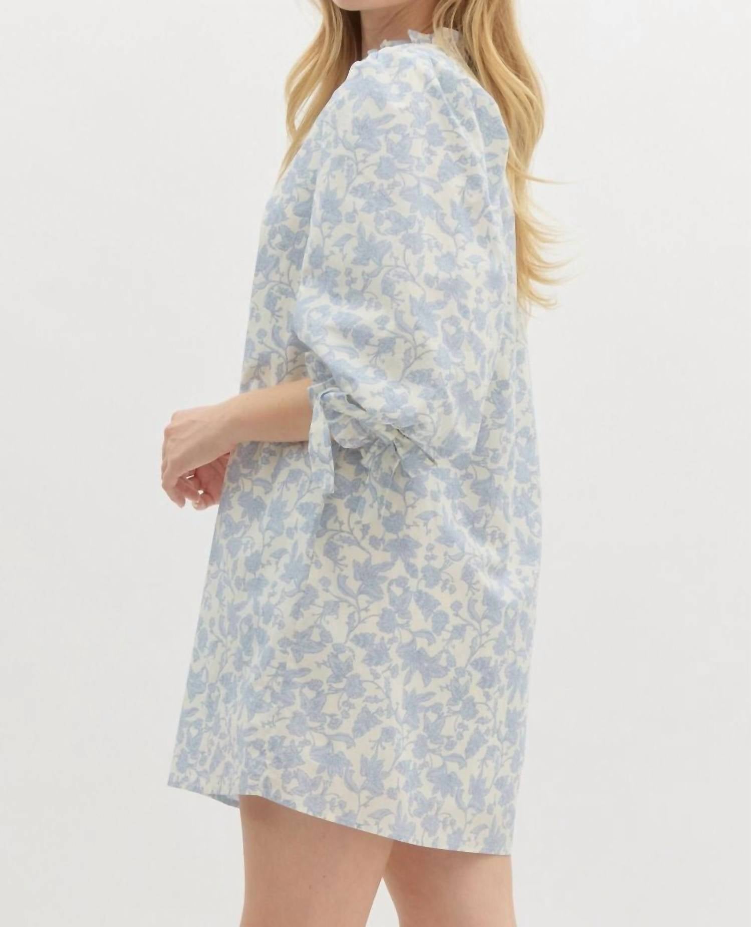 Introducing the Floral Print Pullover Mini Dress by Entro, a charming choice for those who love floral designs. Featuring long puff sleeves with elasticated openings and fixed ribbons, this dress is both stylish and functional with side pockets. Crafted from a lightweight woven material with a sheath silhouette, this dress offers ease with its pull-on closure. Care: Machine wash, lay flat to dry. Available in blue, with bust measurements of small 40", medium 42", large 44", and lengths of small 33", medium 34", large 35".