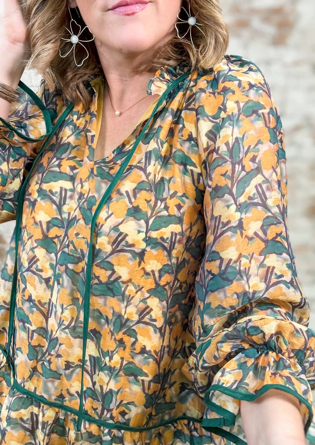 Introducing the Floral Print Tiered Dress by Entro, a charming mini dress in a lush Hunter Green floral design. This dress features long sleeves and a stylish V-neck, accented with tiered ruffles for added flair. Crafted from 80% Tencel and 20% Nylon, it includes a convenient tie closure.