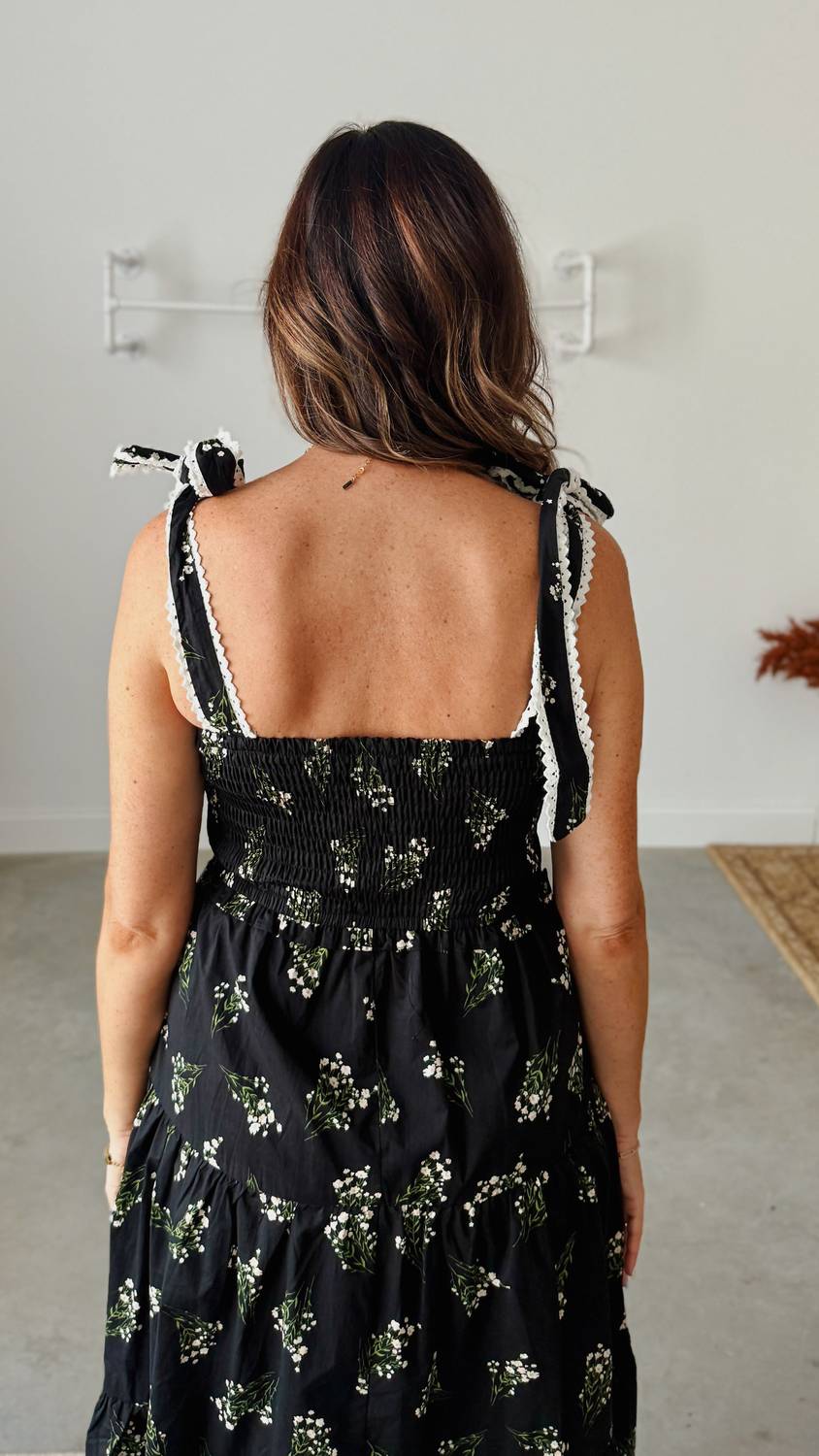 Introducing the Entro Floral Tiered Midi Dress, a must-have for your summer wardrobe in timeless black with a playful floral pattern. This sleeveless A-line dress is crafted from 100% cotton for a comfortable fit and features a charming scallop-trimmed shoulder tie closure. The squareneck design and elasticated smocking top panel create a flattering silhouette, while hidden side pockets add practicality. Ideal for any boho-chic occasion, this dress provides effortless style for housewarming events and Easter gatherings.