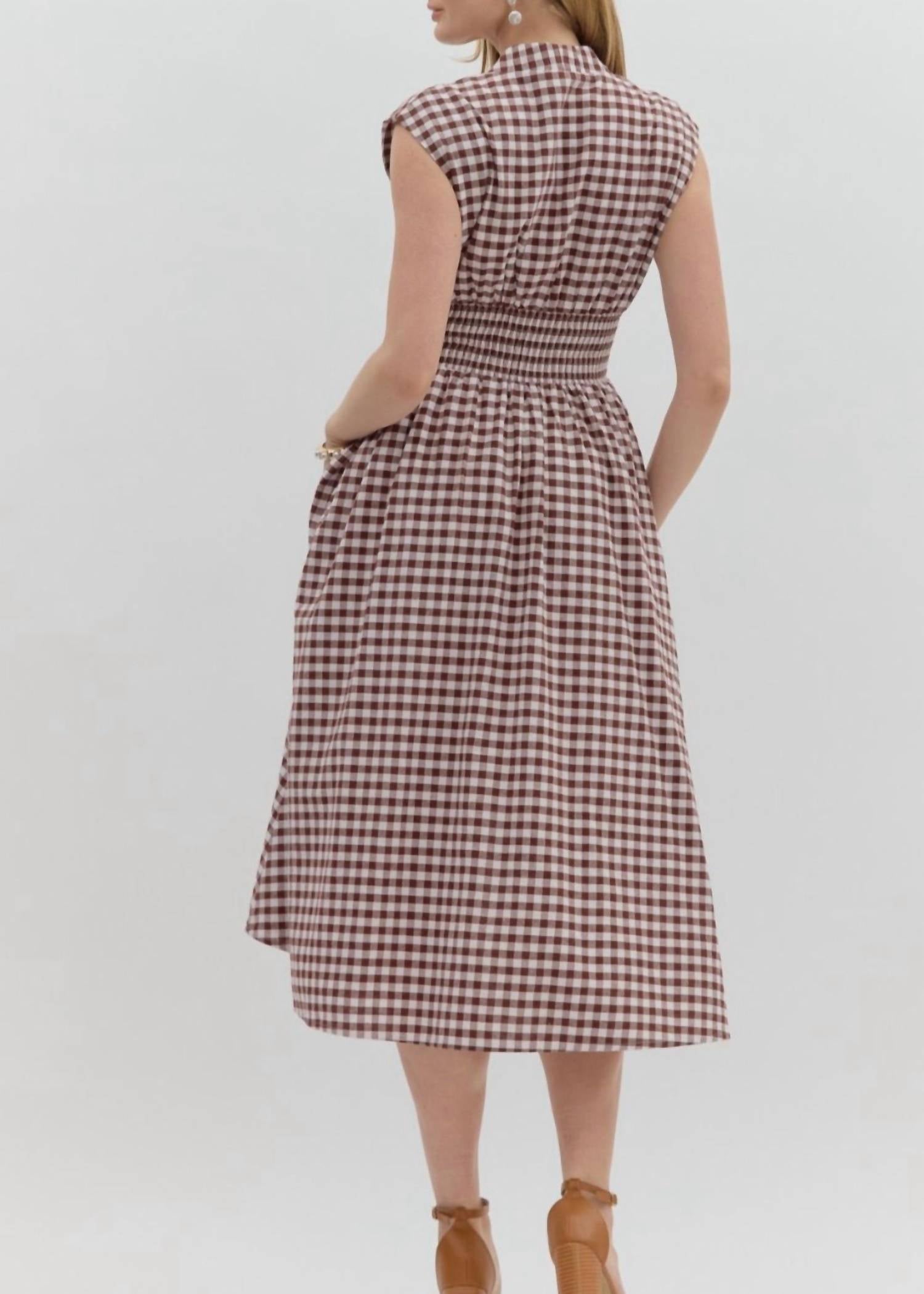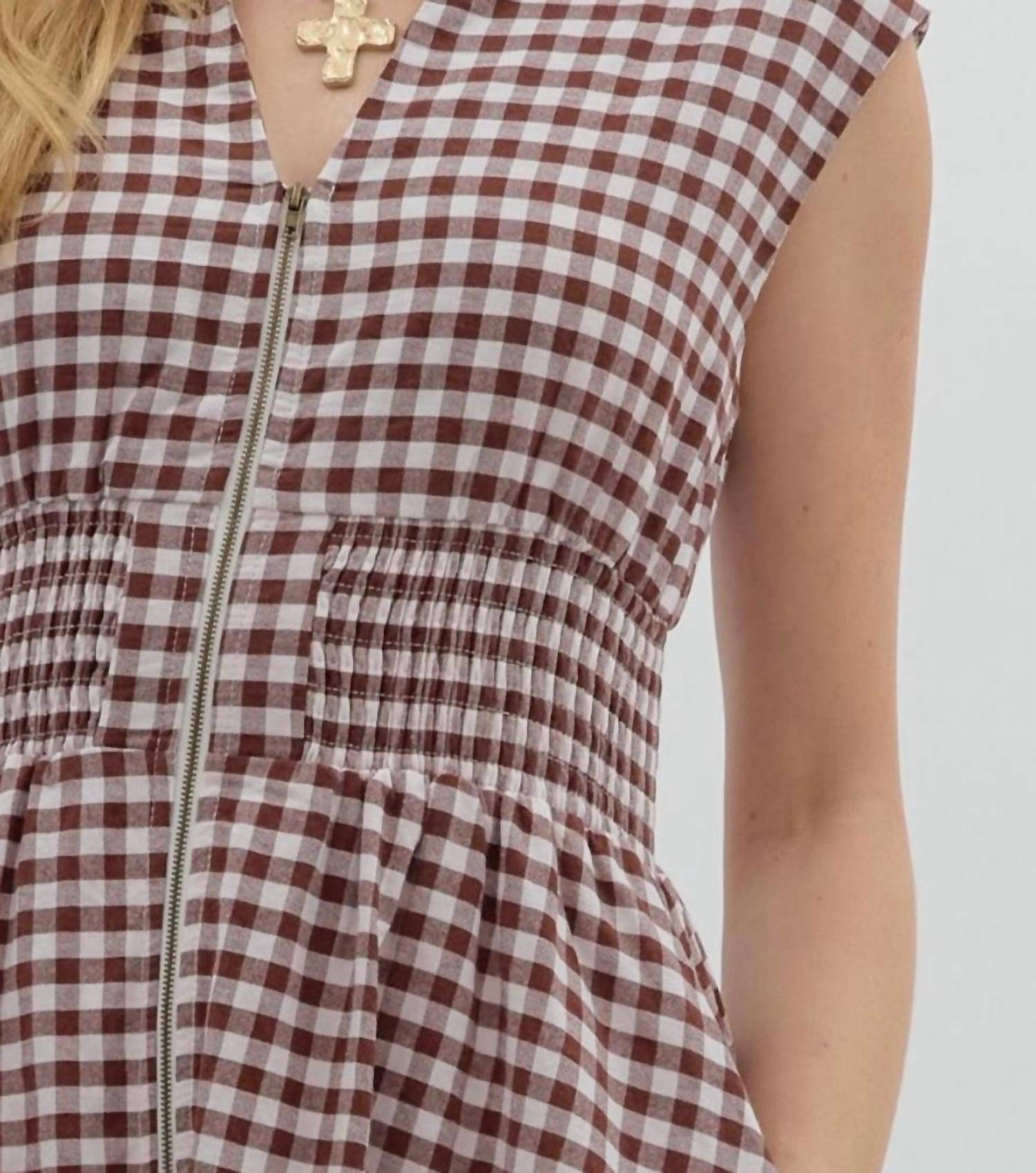 Introducing the Ginger Gingham Midi Dress by Entro, a charming addition to your spring wardrobe. This sleeveless dress features a flattering V-neck and an A-line silhouette with a front zipper closure for easy wear. Crafted from 100% cotton, it offers comfort with practical side pockets and smocking at the waist for a tailored fit. Perfect for a Thanksgiving holiday party, this lightweight, lined dress showcases a timeless gingham pattern. Model is 5'10" and is wearing a size Small.