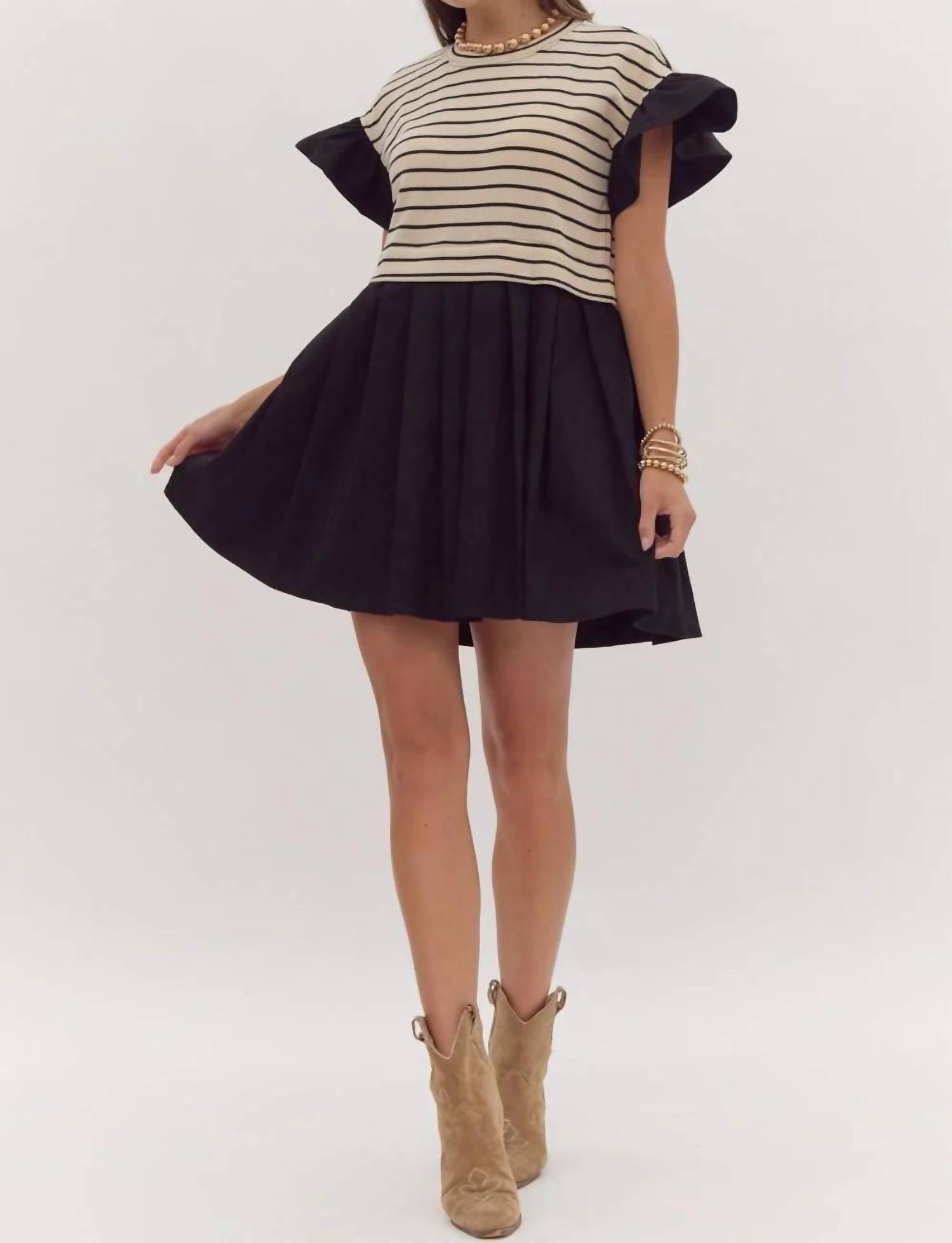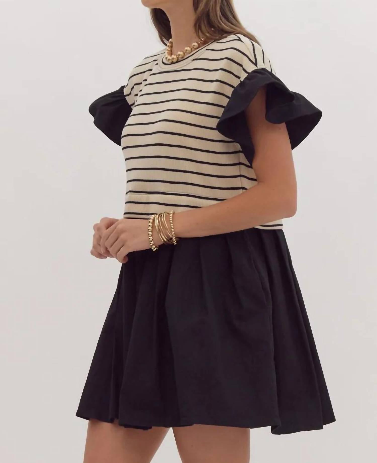 Stylish mini dress that effortlessly blends comfort and pattern flair. Features cap sleeves and a crew neckline. Crafted from polyester for a sweater knit top and playful poplin skirt combination. Offers a flattering A-line silhouette in a striking black and white stripe pattern. Easy to wear with a pull-on closure. Machine washable.