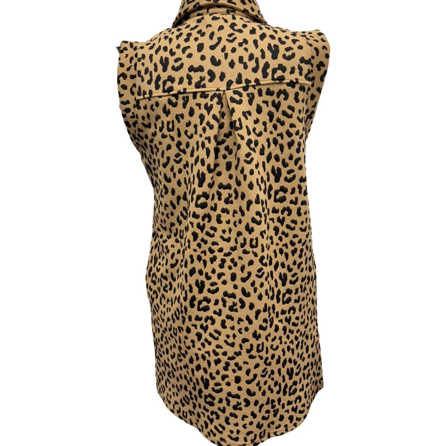 Introducing the Leopard Print Sleeveless Mini Dress by Entro, a chic camel-hued piece perfect for a playful, boho-chic look. This mini dress features a structured collar and a shift silhouette, crafted from a blend of 74% Polyester, 23% Rayon, and 3% Spandex, with a 100% Polyester lining. Designed with practical side pockets, it's easy to wear with a pull-on closure. Ideal for spring dinner parties, layer it your way for versatile style options.
