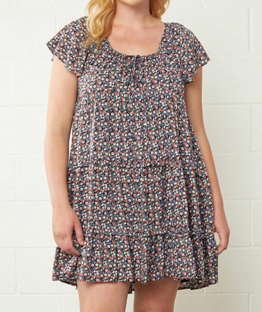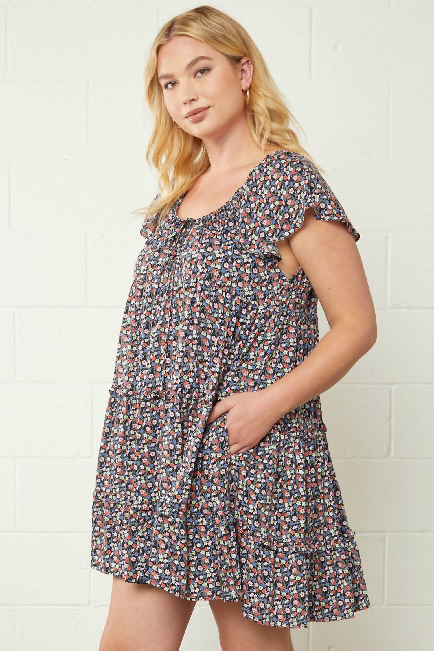 Elevate your summer wardrobe with the Micro Floral Tiered Dress by Entro, a vibrant piece adorned with multi-color flowers on a black background. This plus-size A-line mini dress features cap sleeves, a scoopneck with adjustable tie closure, and a flattering shift silhouette, complete with ruffle detailing and convenient side seam pockets. Expertly crafted from 100% Rayon with a polyester lining, this dress ensures both comfort and style for your next vacation or Thanksgiving gathering. Care for it by hand washing or opting for a dry clean, with sizes including XL (Bust 48”, Length 36”), 1X (Bust 50”, Length 36”), and 2X (Bust 52”, Length 36”).