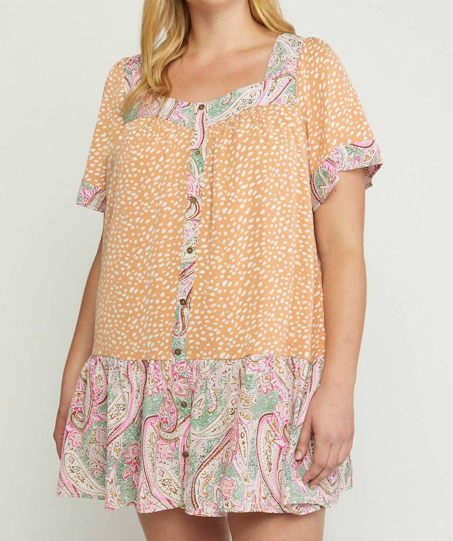 Embrace a boho-chic vibe with the Mixed Print Square Neck Dress by Entro, tailored for a flaunting, feminine style. This plus-size dress comes in a vibrant multi-patterned design featuring a square neckline and short sleeves. Crafted from 100% polyester, it boasts fully lined construction, side seam pockets, decorative button closure, a ruffled hem, and an A-line mini silhouette. Care instructions include hand wash or dry clean, with a versatile fit available in dimensions from XL to 2X, all with a length of 36". Perfect for your next summer getaway.