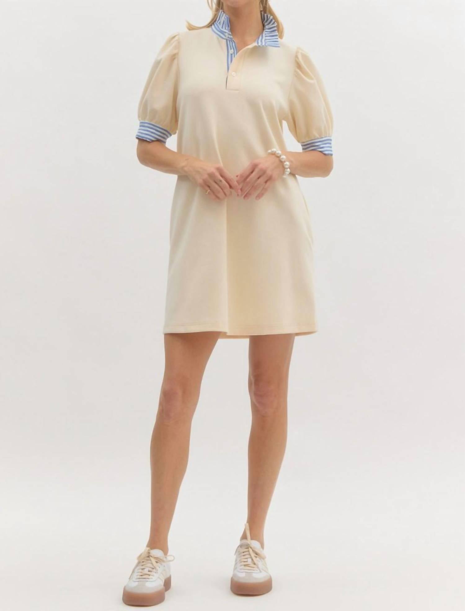 Discover the Mock Neck Contrast Striped Mini Dress by Entro, a stylish option in a chic cream color perfect for birthdays and Thanksgiving. This women's shift silhouette features short sleeves and is crafted from breathable cotton. With its pull-on closure and mockneck design, it ensures a sleek and comfortable fit. Care instructions include machine wash and tumble dry, making it a practical yet fashionable choice for your spring wardrobe.