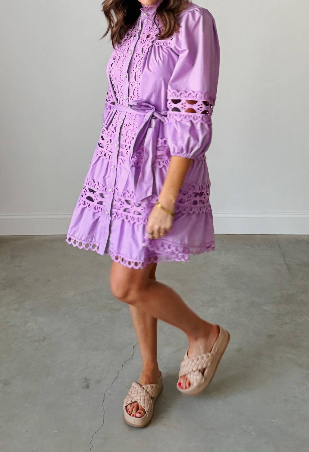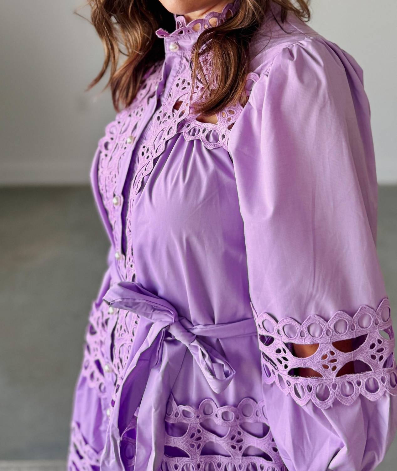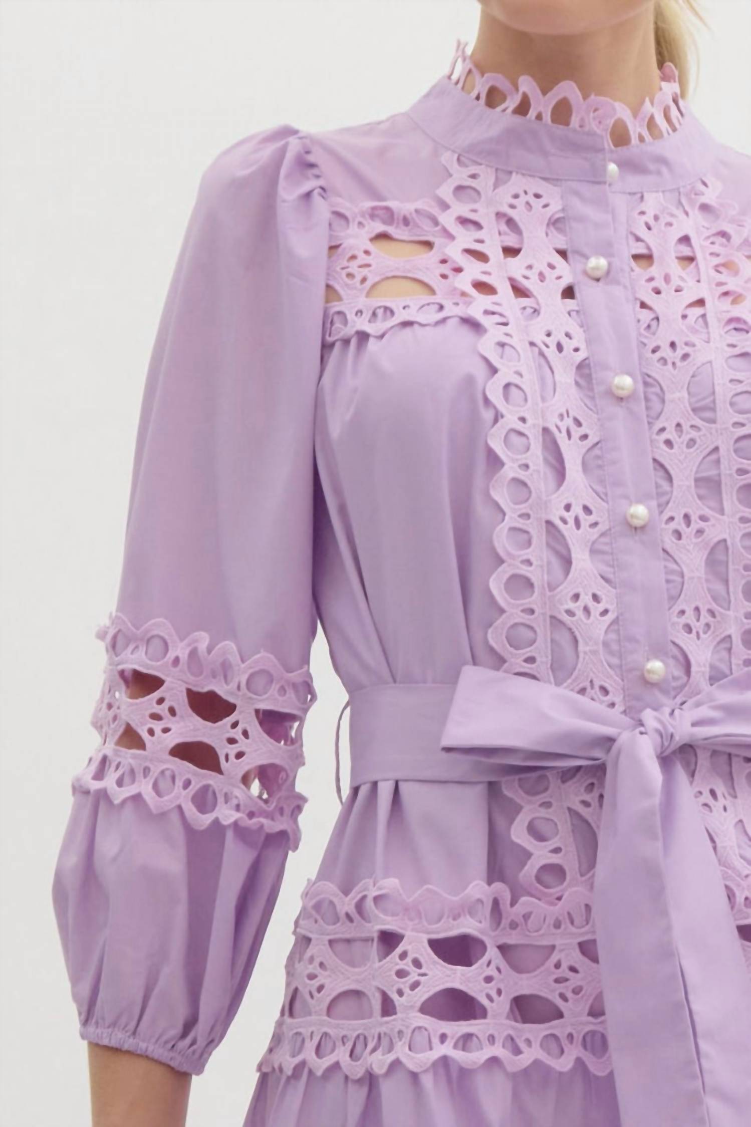 A short and breezy dress for those warmer days. Introducing the Pearl & Lace Mini Dress by Entro, a charming addition to your spring wardrobe in a delightful lilac hue. This textured A-line dress features three-quarter sleeves and a sophisticated mockneck, elegantly adorned with pearl button closures and lace trim. Made from 100% cotton, it offers a flattering silhouette with its self-tie waist, ensuring both style and comfort. Care is simple with machine wash instructions, making it an effortlessly chic choice for occasions such as baby showers, embodying the boho chic trend.