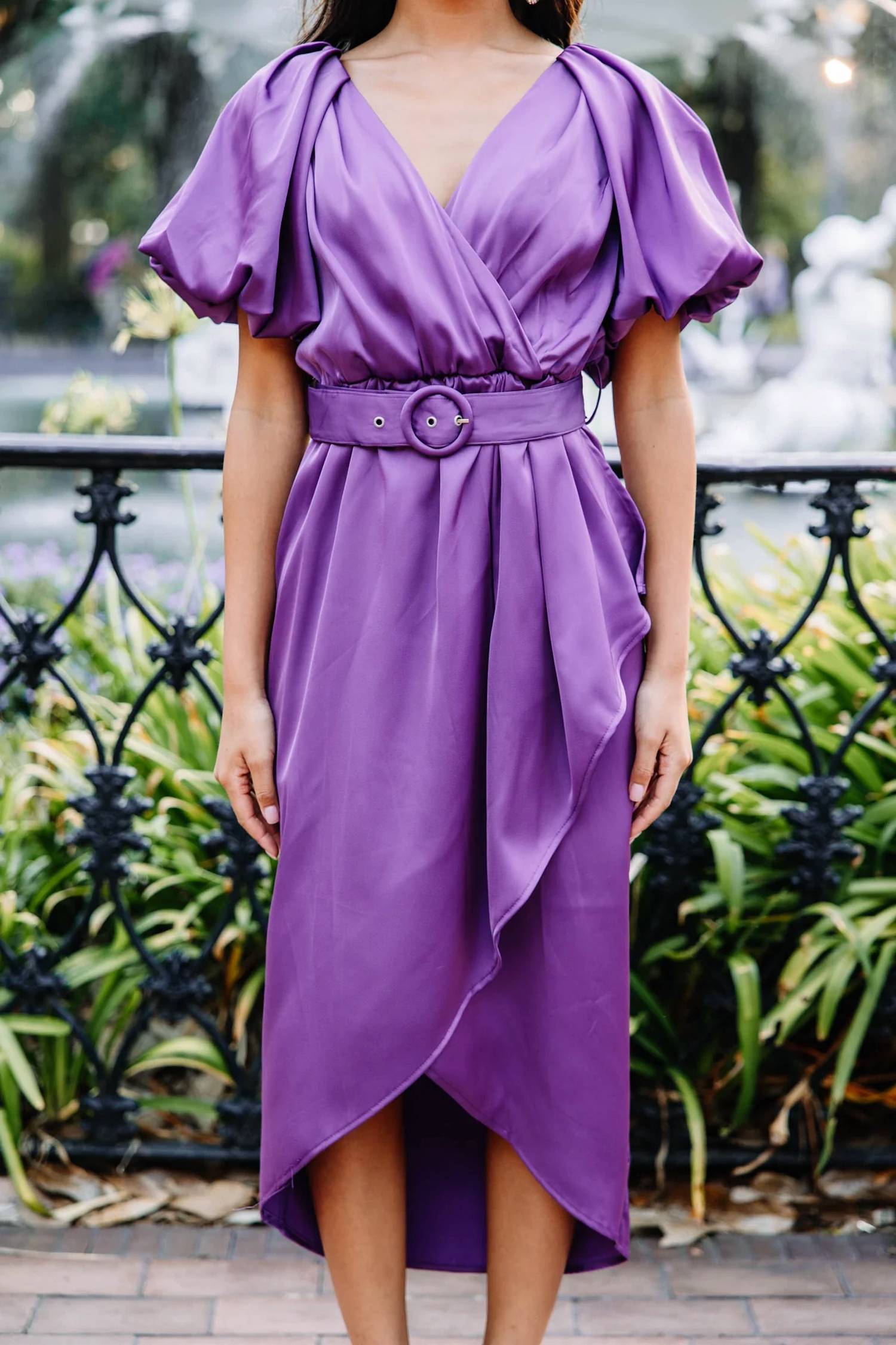 Just add slides or mules and you are good to go. Introducing the Puff Sleeve Satin Dress by Entro, an exquisite piece perfect for your evening events this spring. This dress features short bubble sleeves and a sophisticated V-neckline, with a flattering A-line midi silhouette that measures 47 inches in length. Made from 100% polyester satin in a striking purple hue, it boasts a wrap style with a belted waist, and showcases pleated shoulders for added elegance. Care for this fully lined, non-sheer dress with hand wash methods and line dry to maintain its quiet luxury essence.