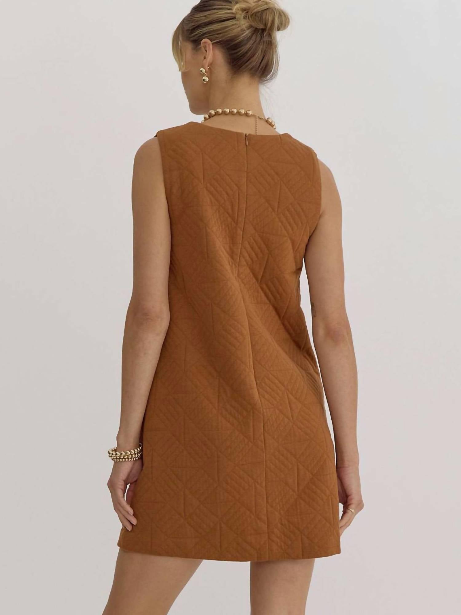 Presenting the Pumpkin Spice Dress by entro, a chic and functional choice for your wardrobe. This brown, sleeveless A-line mini dress features a textured, 55% Polyester 43% Cotton 2% Spandex blend fabric with a stylish V-neckline and practical front pockets. It offers a comfortable zip closure, making it perfect for any summer occasion like a holiday party. Experience effortless style with this piece that runs true to size.