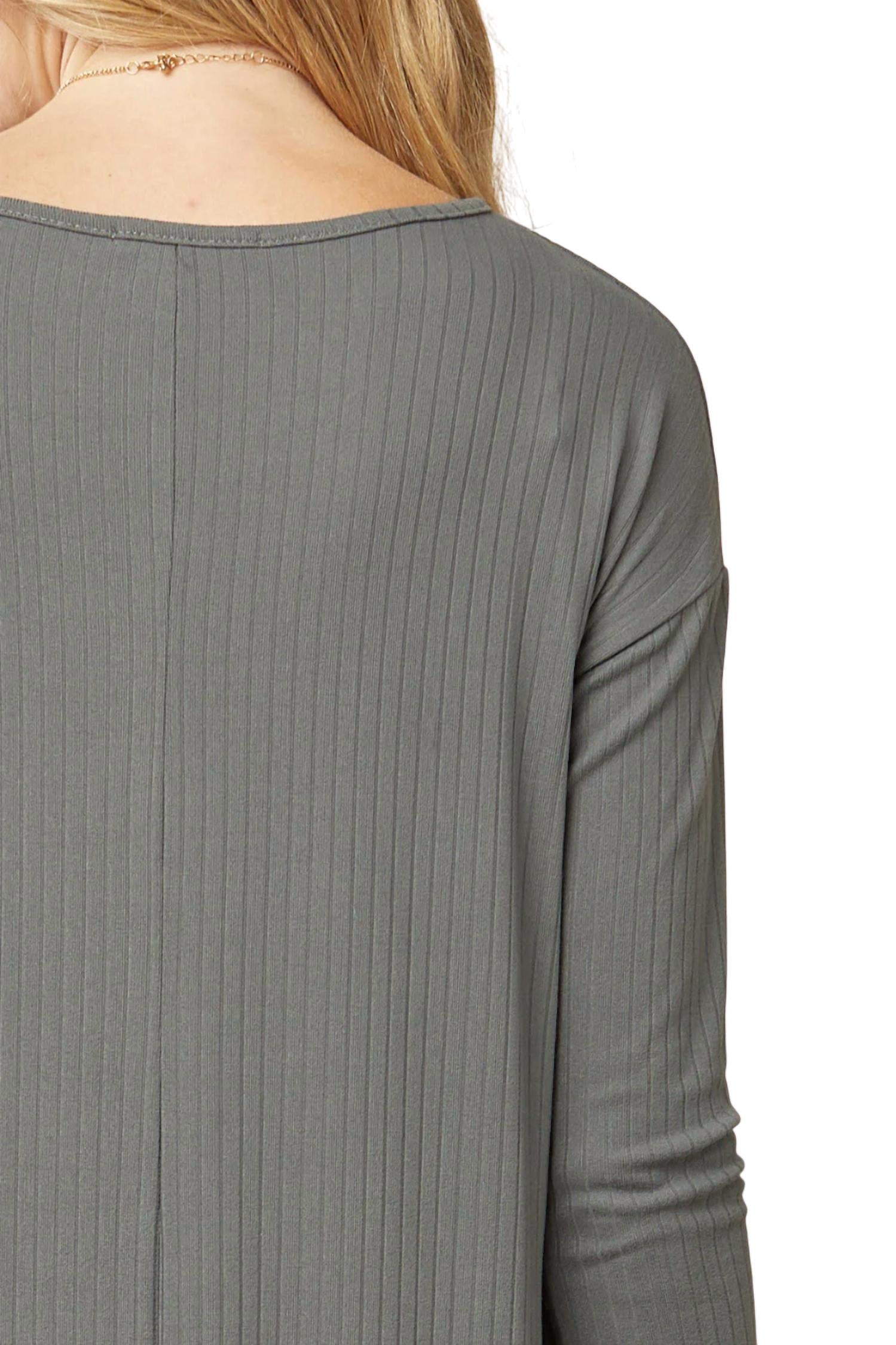 Features a round neckline, dropped shoulders, long sleeves, side seam pockets, a scooped high-low hemline, and a midi silhouette. Small: Bust 42", Length 44". Medium: Bust 44", Length 44". Large: Bust 46", Length 44". Back hem is longer. 95% polyester, 5% spandex. Made in the USA. Hand wash or dry clean.