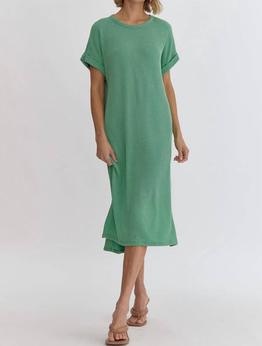 The perfect length dress does exist. Meet the Ribbed Short Sleeve Midi Dress by entro, designed to captivate in a sophisticated jade hue. This stylish dress features a short sleeve design with a flattering slit at the side hem, perfect for any occasion. Crafted from a comfortable blend of 76% Polyester, 21% Rayon, and 3% Spandex, it is lightweight, knit, and non-sheer for effortless wear. Closure: Pull-on. With its A-line silhouette and textured pattern, this dress is a chic addition to any wardrobe.