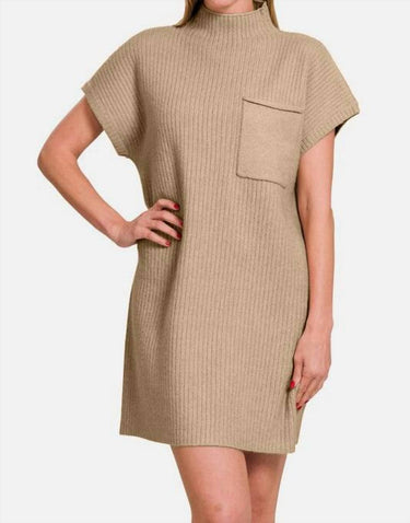 Embrace minimalist elegance with the Ribbed Sweater Dress by Entro, perfect for any evening event. This tan shift dress features short sleeves, a mockneck, and a textured pattern, offering a basic yet sophisticated style. Closure is designed for ease with a pull-on fit, complemented by a practical patch pocket and slightly stretchy fabric for comfort. Care is straightforward with machine wash and lay flat to dry instructions.