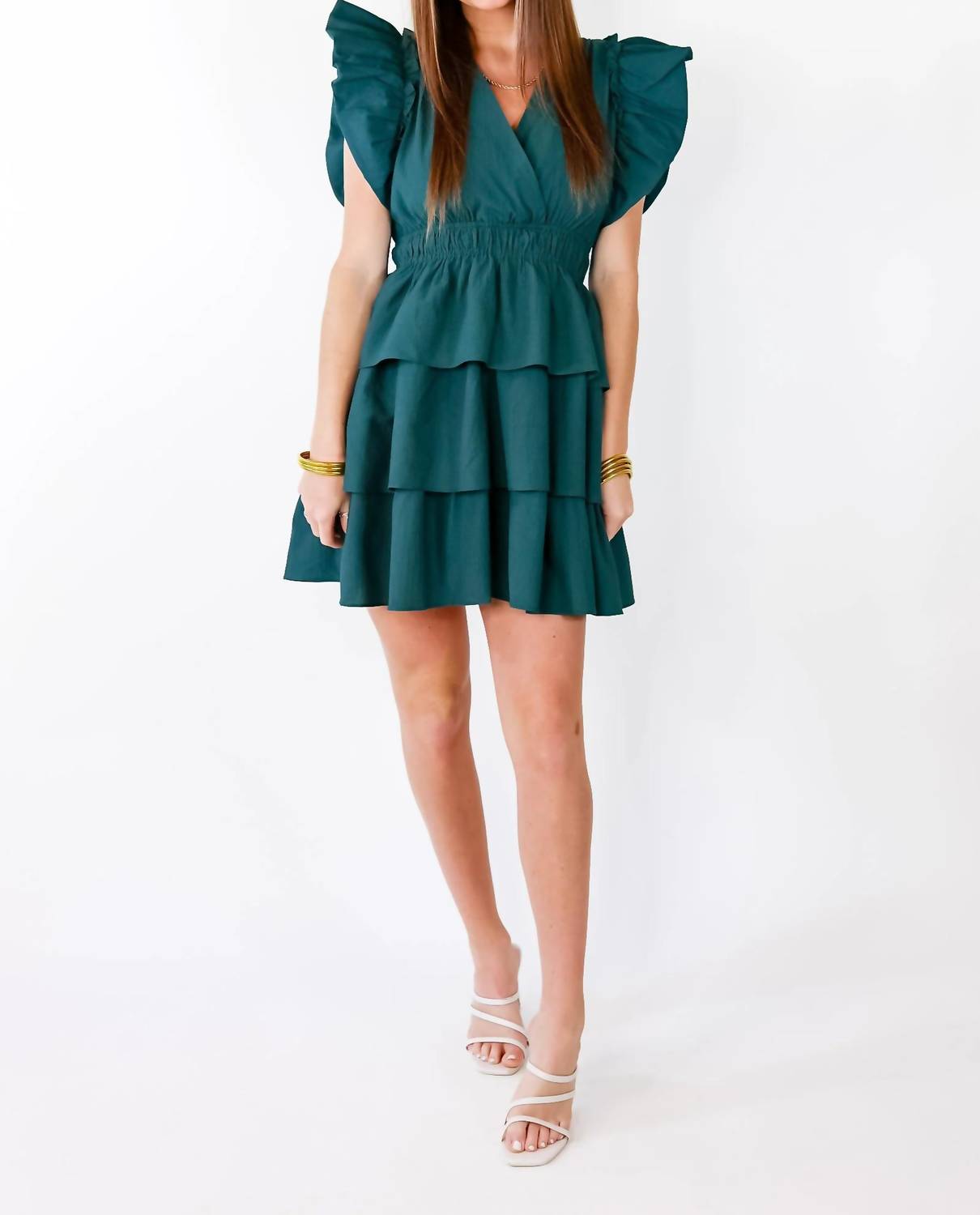 Introducing the Ruffle Mini Dress by Entro, a stunning green evening piece that brings minimalist elegance to your wardrobe. This A-line dress features cap sleeves, a v-neckline, and dramatic ruffled details, with a cross-front and tiered skirt adding to its charm. Made from 100% Polyester, the dress has a chic pull-on closure and measures 33 inches in length. Care instructions include hand washing and line drying to maintain its pristine condition. Perfect for a summer evening event, this solid, pocket-free design is sure to make a statement.