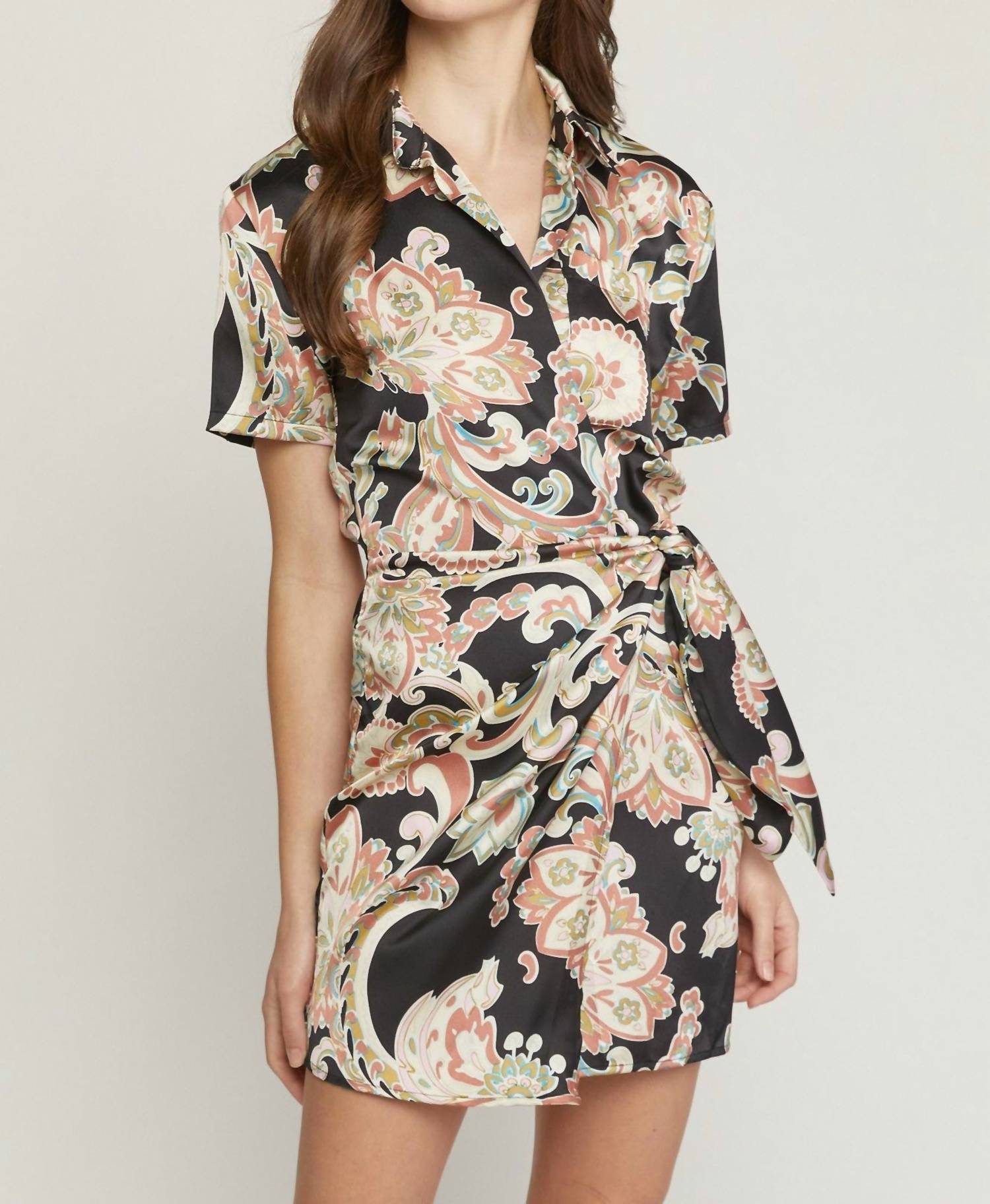 Entro - Satin Paisley Short Faux Wrap Dress