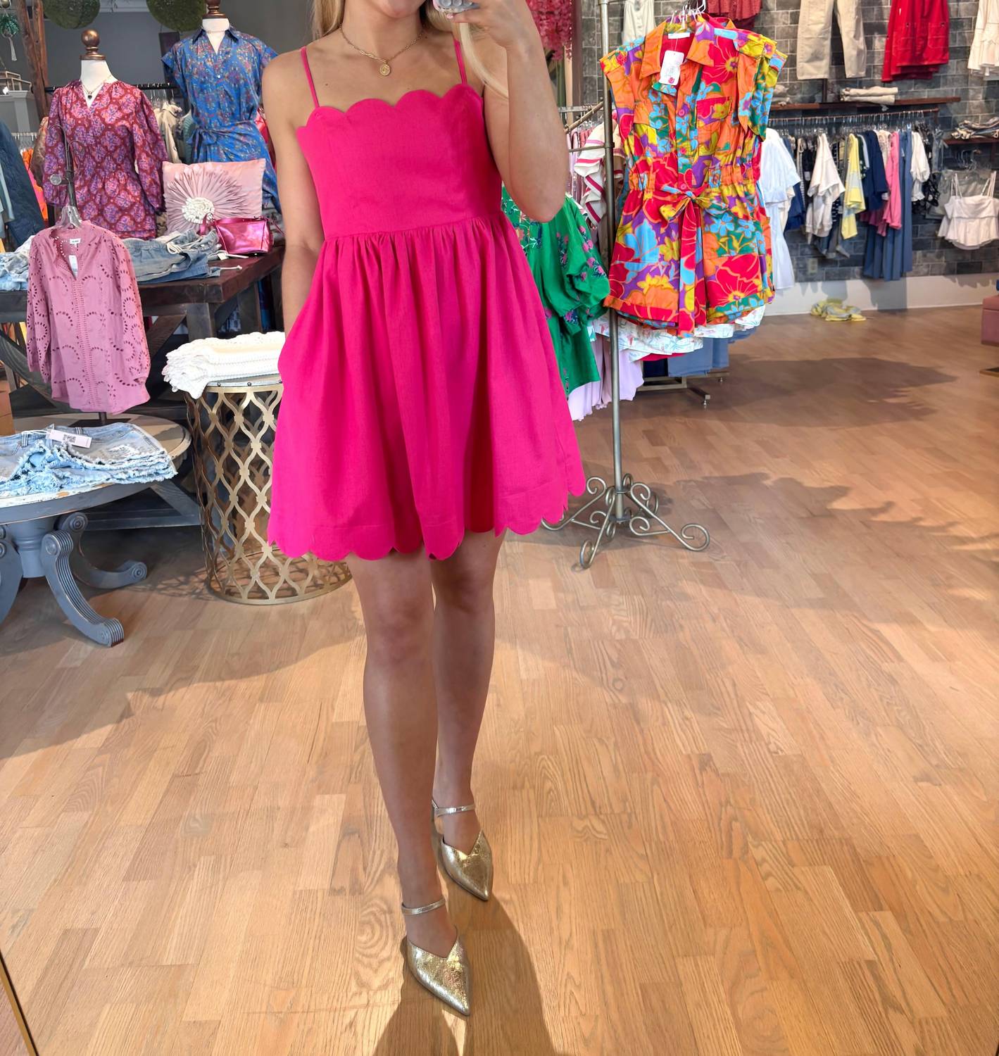 Solid adjustable shoulder strap pullover mini dress featuring scallop accent neck and hem finish. Elasticated skirt waist and bow tie closure at back. Pockets at sides. Lined. Woven. Non-sheer. Lightweight.