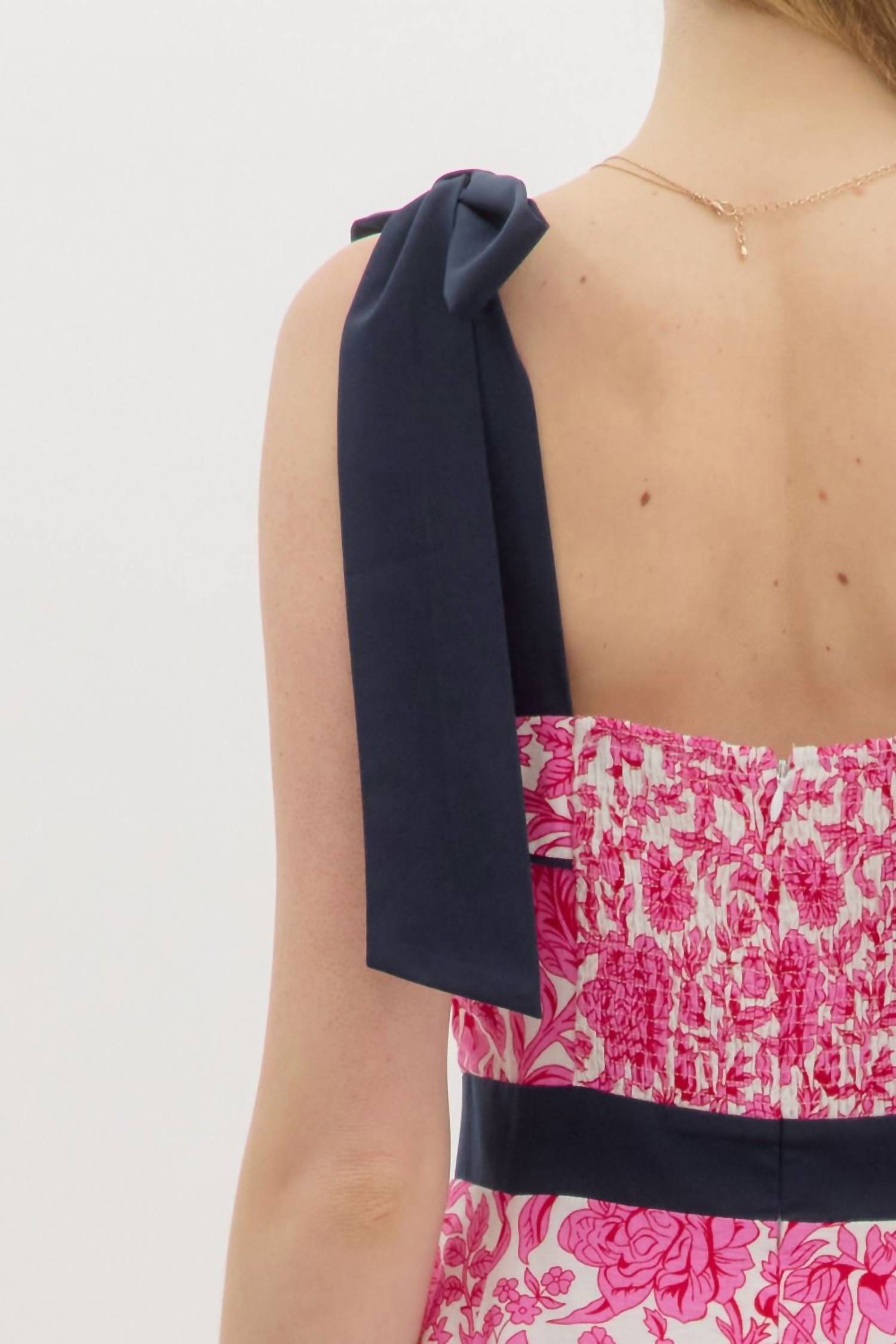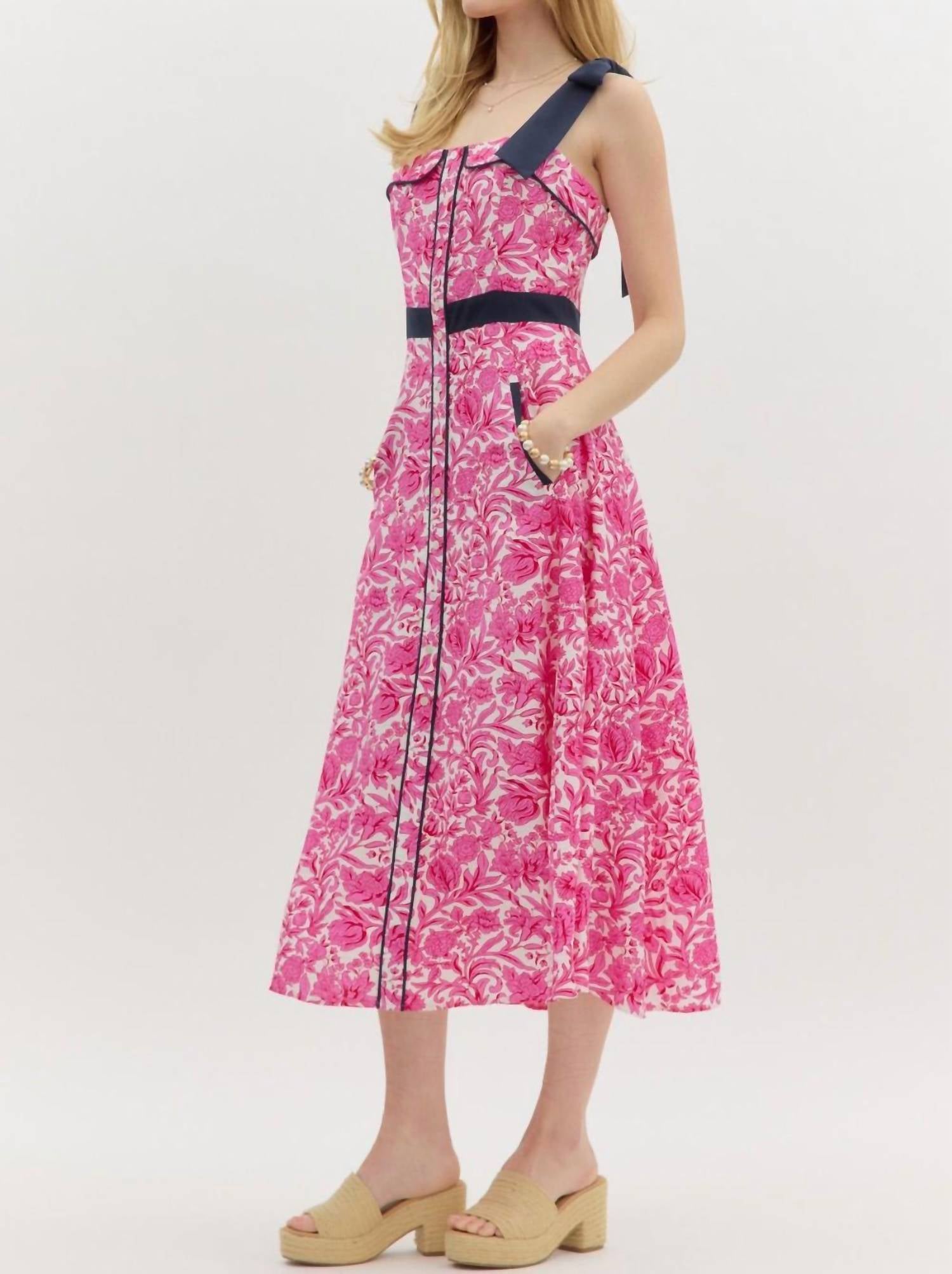 Show off just the right amount of skin in this adorable assymetrical dress. Introducing the Shoulder Tie Print Midi Dress by Entro, a captivating sleeveless piece designed in a floral pattern that is perfect for summer holiday parties. Made with asymmetrical A-line silhouette, this dress features a unique squareneck and charming bow tie shoulder straps for an elegant touch. It includes a faux button detail at the front, smocked back zipper closure, and convenient welt pockets for added practicality. Care for this pink beauty is simple with machine wash, making it an effortless addition to your wardrobe.