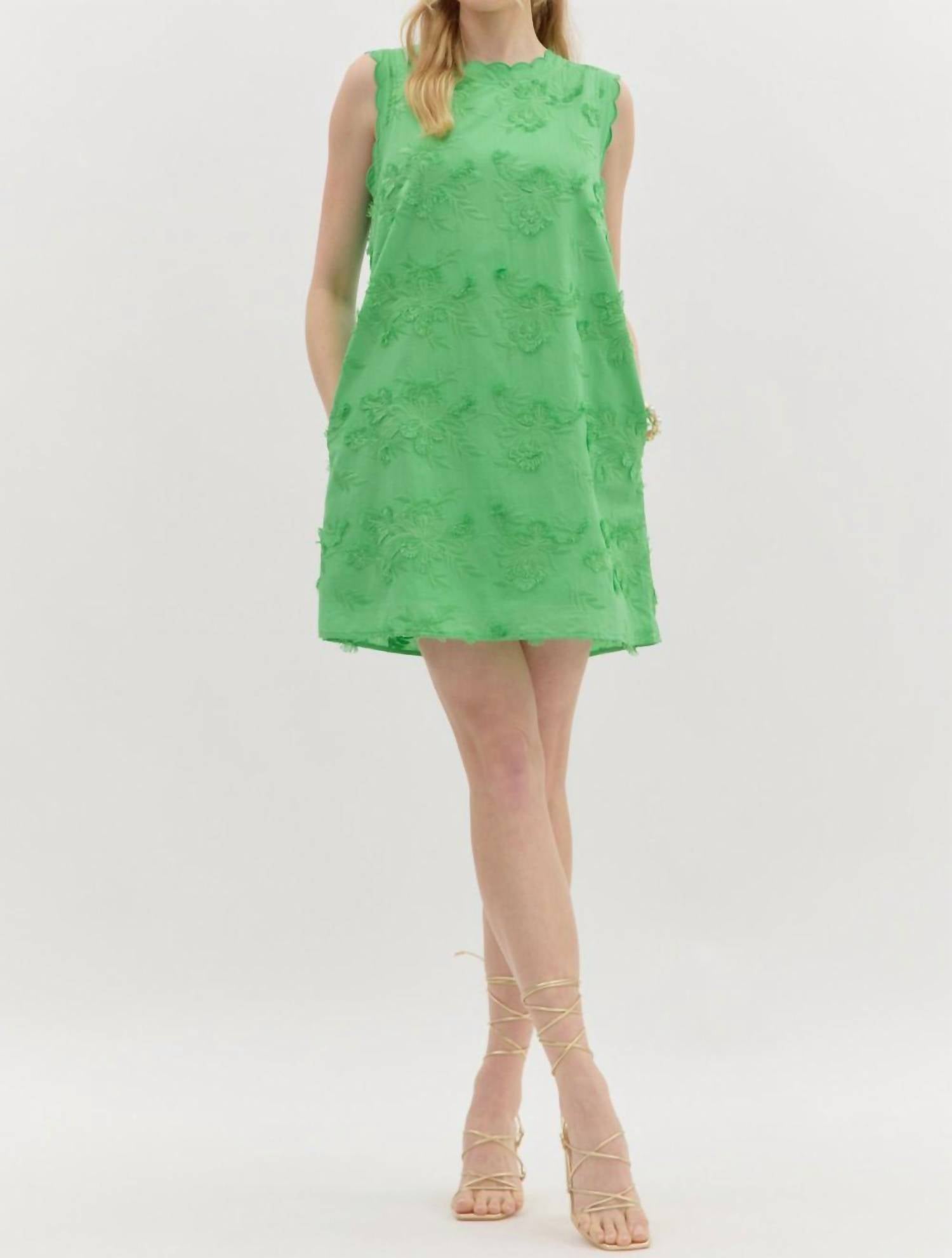 Elevate your summer wardrobe with the Sleeveless Floral Appliqué Mini Dress by Entro, featuring intricate 3D floral appliqués and a chic embroidered scallop finish. This lightweight shift dress comes in an eye-catching Kelly Green hue, crafted from a 50% Cotton, 50% Polyester blend, ensuring comfort and style. The sleeveless mini design includes practical side pockets and a convenient single button keyhole closure at the back. With a classic crewneck silhouette, this non-sheer, lined dress is perfect for warm-weather outings.