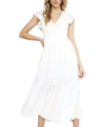 The perfect length dress does exist. Elevate your summer wardrobe with the Smocked Dress by Entro, perfect for vacation and minimalist trends. This A-line silhouette in solid white features cap ruffle sleeves and a flattering V-neckline. The dress includes a button front closure and smocking at the bust, along with handy side pockets for added convenience. Care instructions advise hand washing and line drying to maintain its pristine look.