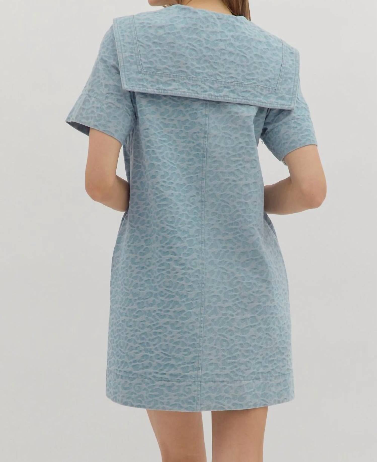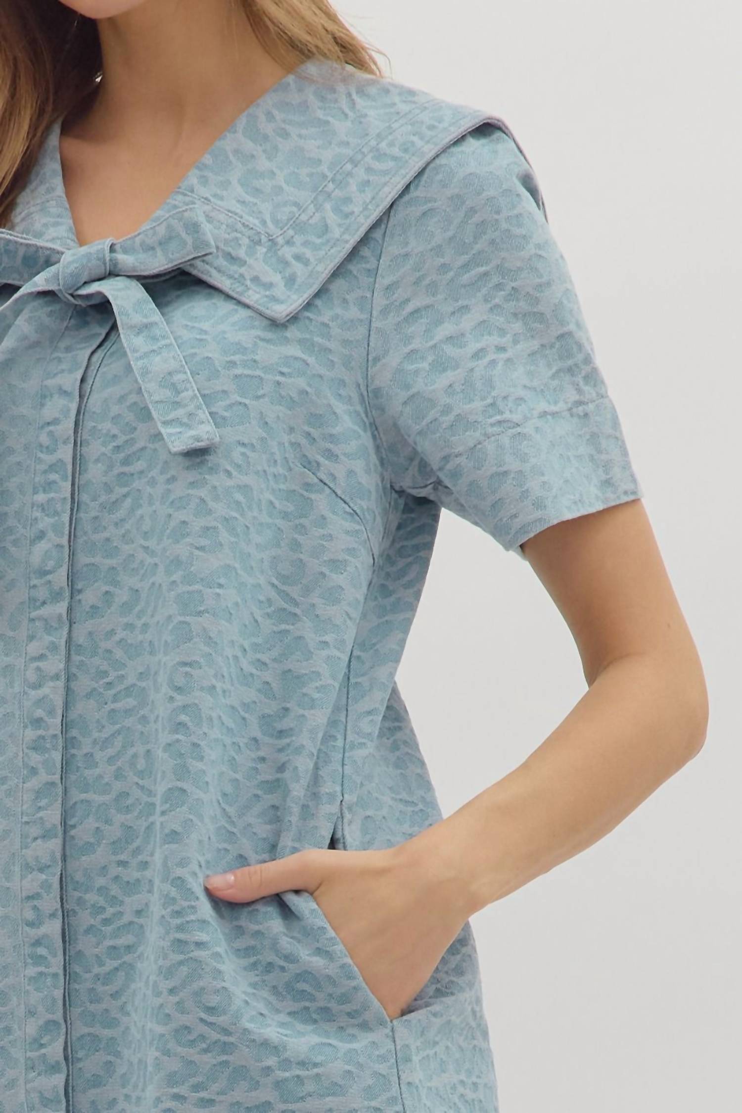 Introducing the Spotted You First Tonal Leopard Denim Dress by Entro, a stylish choice for a boho chic summer look. This mini-length dress features short sleeves and an oversized sailor collar, with a unique leopard pattern texture. It's crafted from a cotton blend: 70% Cotton, 18% Polyester, and 12% Viscose. Closure: Button front closure. The dress also includes convenient side pockets and a charming bow tie accent. Perfect for vacation occasions.