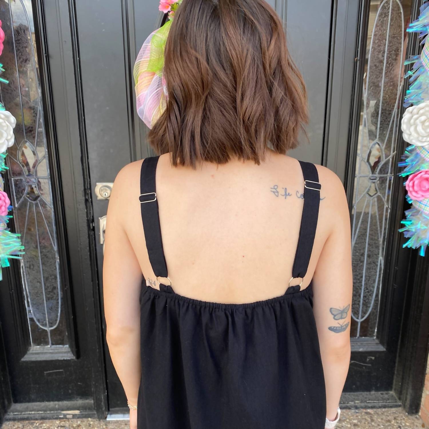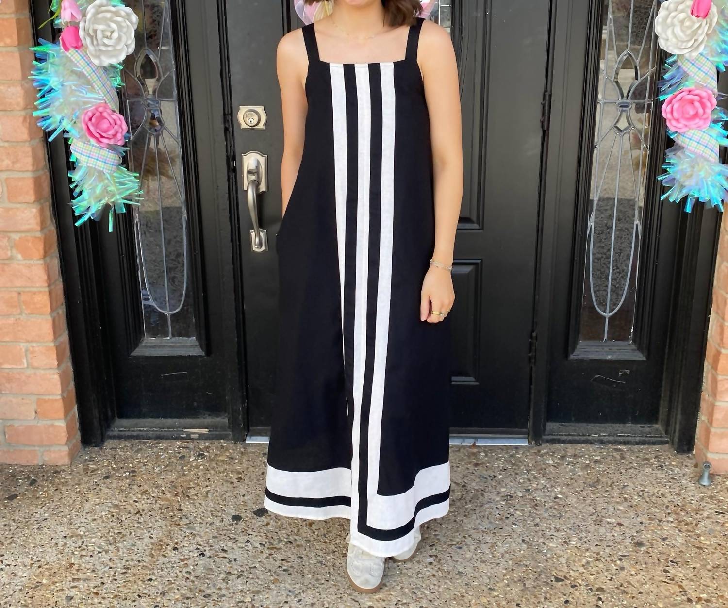 The Black Striped Dress is a simple yet stylish piece, featuring a sleek black design with a white stripe running down the front for a modern touch. Perfect as a vacation dress or swimsuit cover-up, it’s lightweight and breezy, ideal for warm weather and easy to transition into fall. Designed with adjustable straps and elastic along the top back for a comfortable fit, this sleeveless dress flatters with its square neckline and effortless charm.